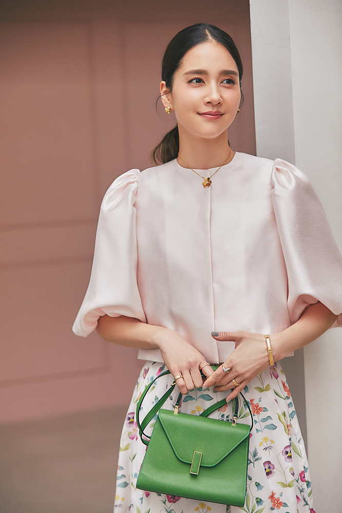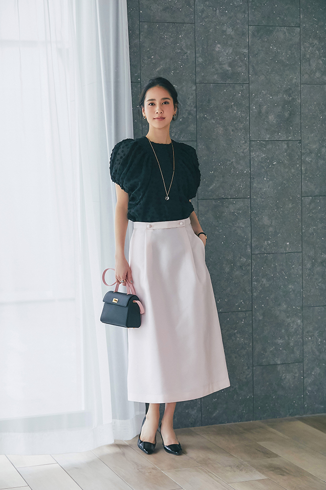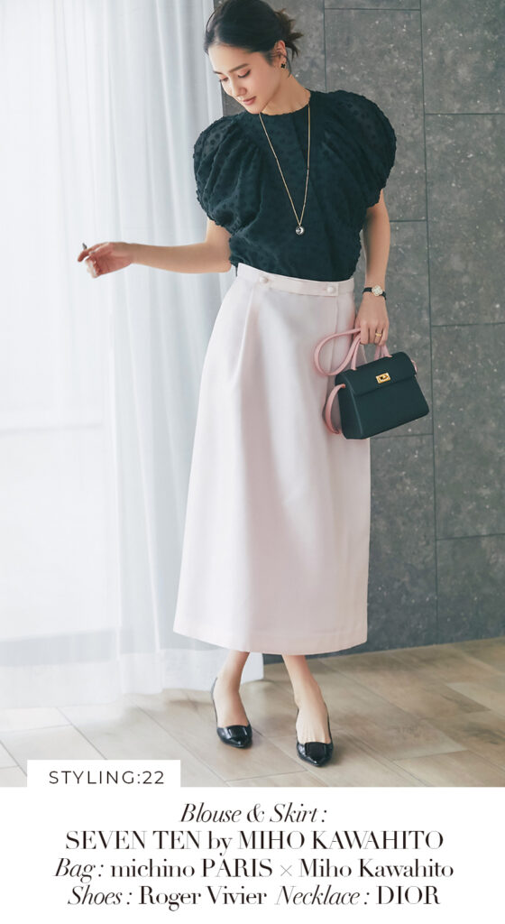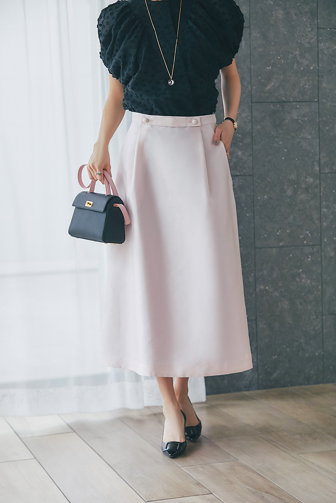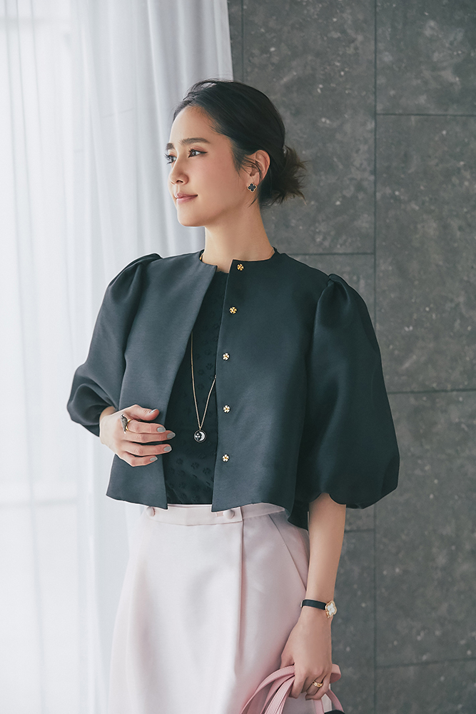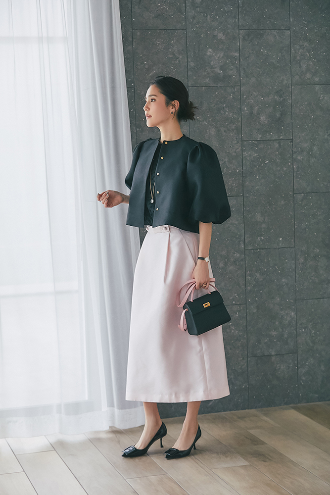 22 ミカドサテンショートジャケット(ブラック) ¥38,500 / ミカドサテンタックタイトスカート(ペールピンク) ¥33,000 / Palais Royalショルダーストラップ+ハンドル別売りセット(ライトピンク) ¥49,000 / ブラウス 3月発売予定