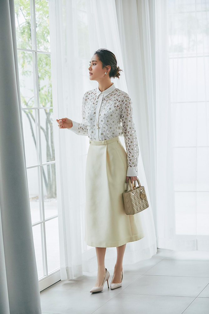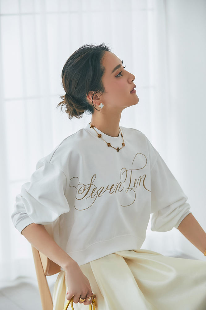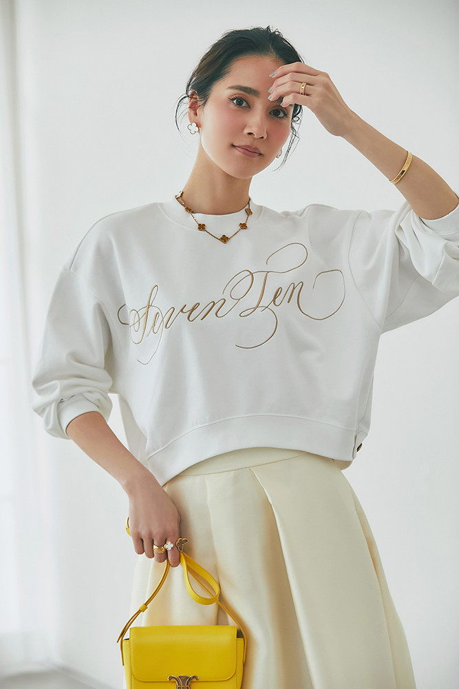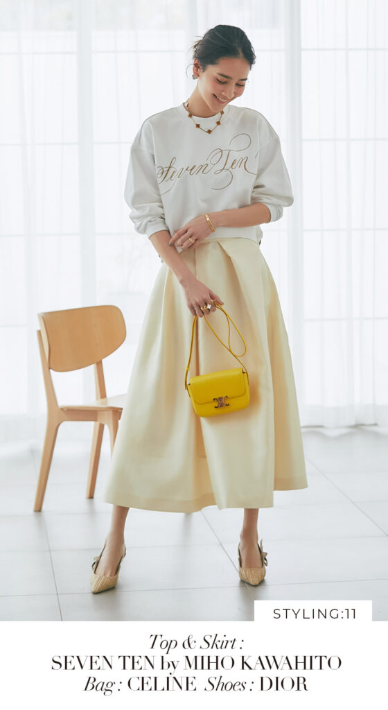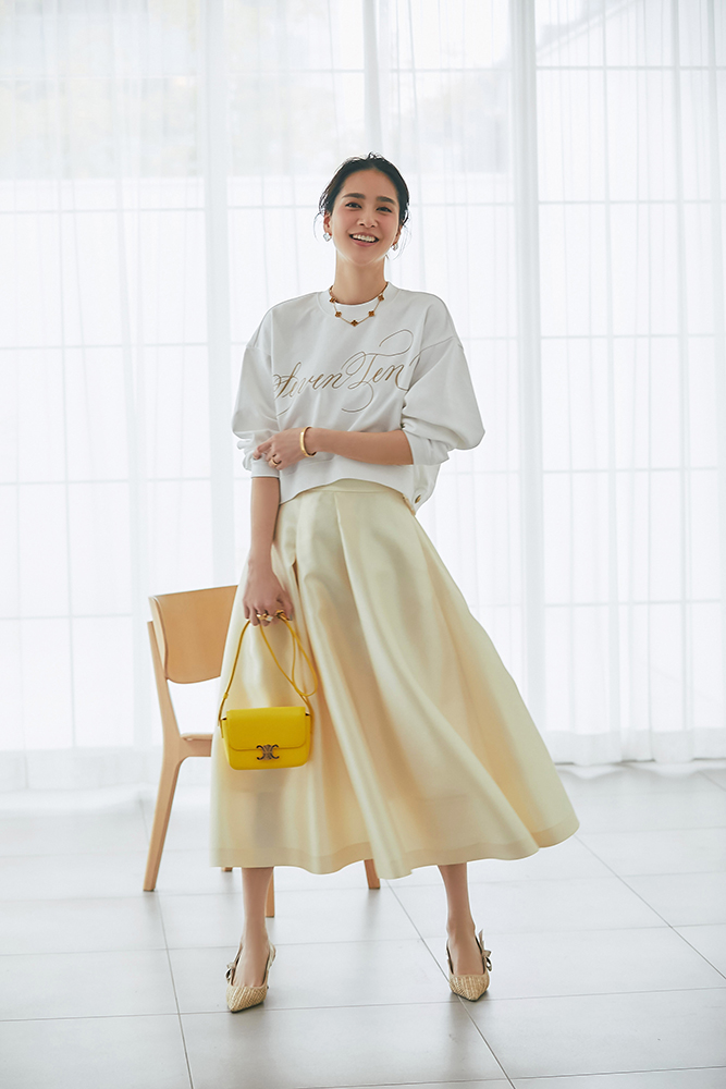 11 カリグラフィ刺繍スウェット(ホワイト×ベージュ) ¥26,400 / ミカドサテンフレアスカート(ペールイエロー) ¥33,000