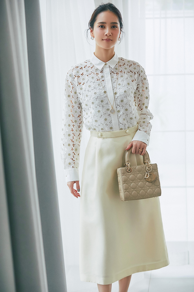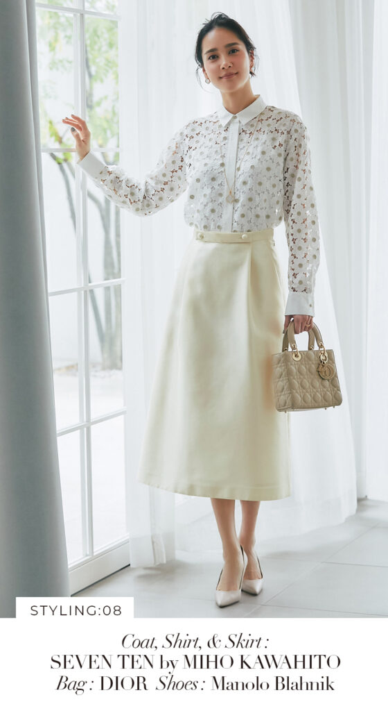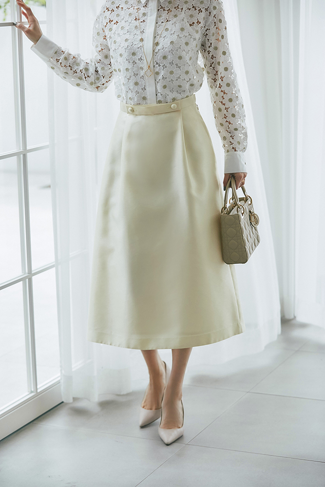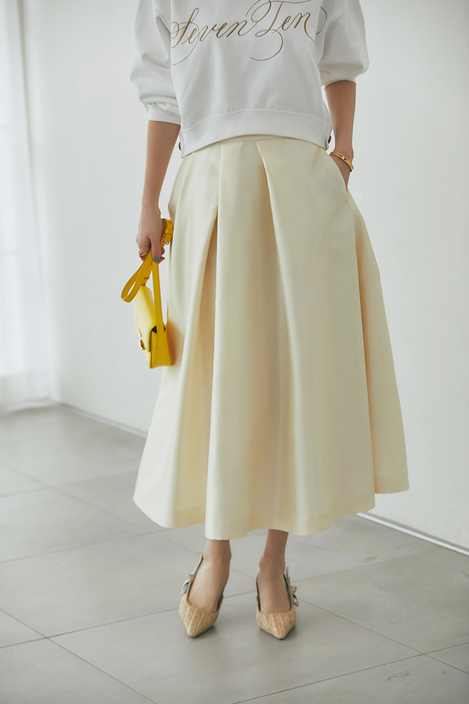 8 ミカドサテンタックタイトスカート(ペールイエロー) ¥33,000 / シャツ 3月発売予定