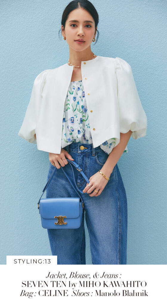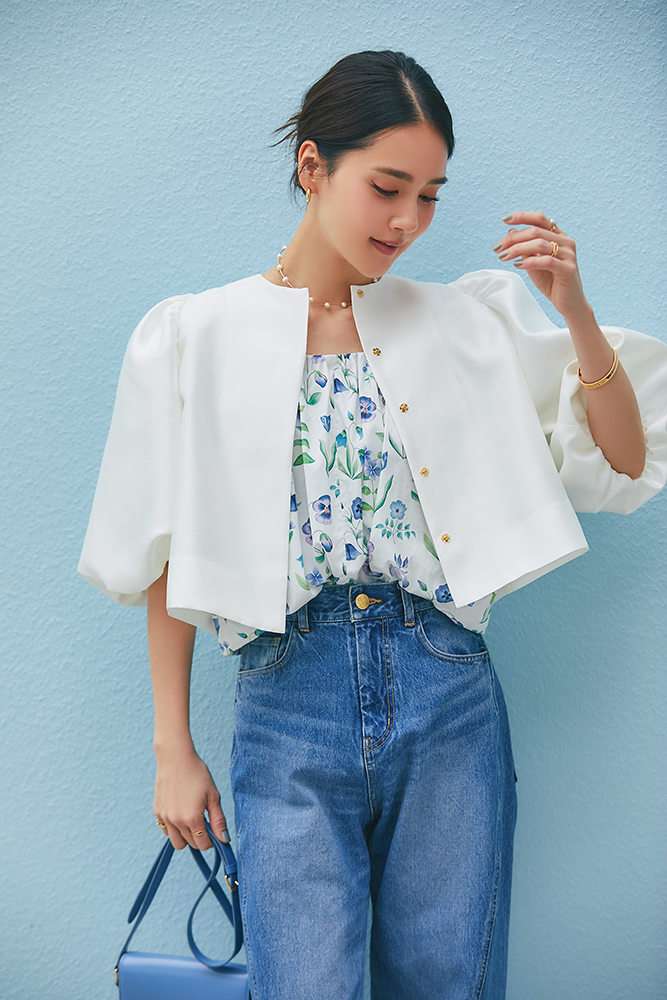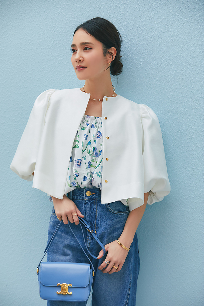 13 ミカドサテンショートジャケット(オフホワイト) ¥38,500 / リバティフローラルバルーンブラウス(ブルー) ¥37,400 / デニム 3月発売予定