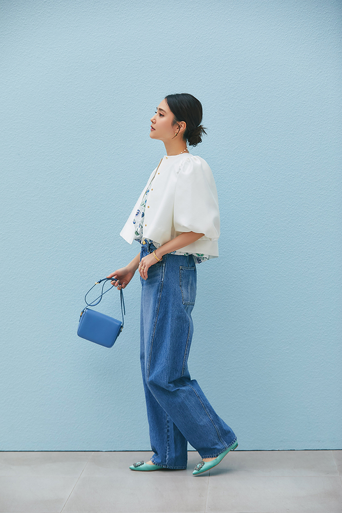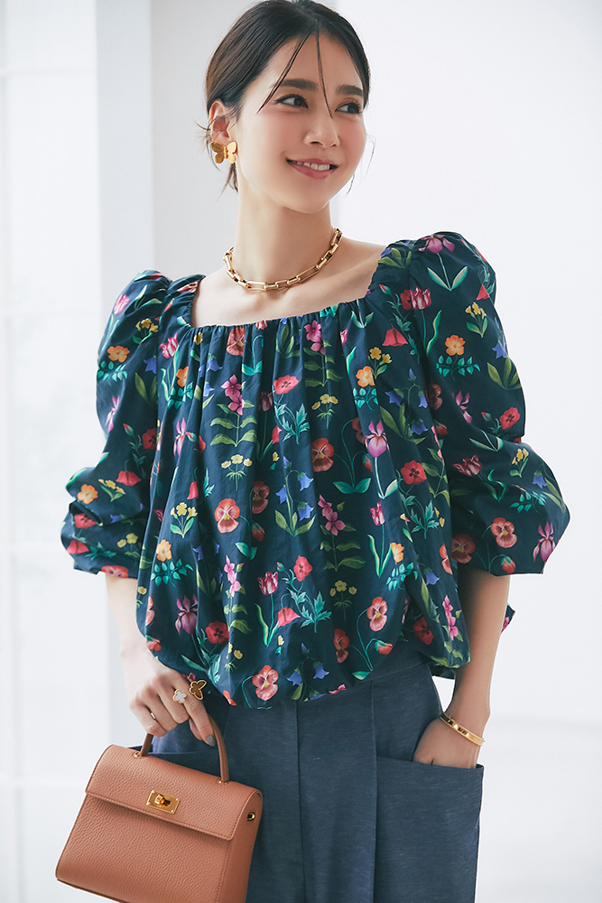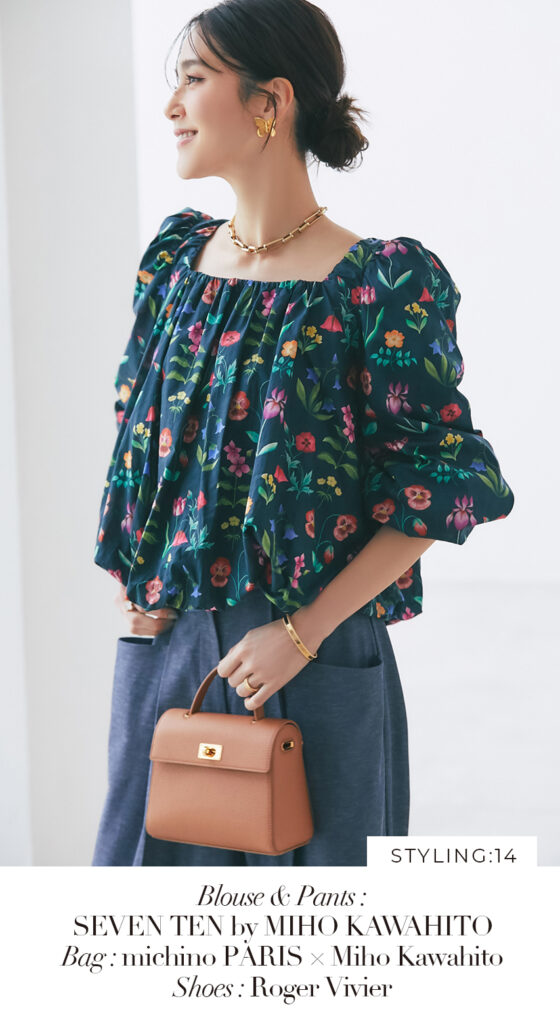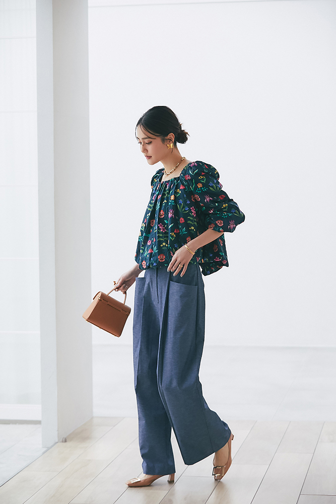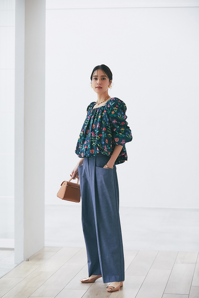 14 リバティフローラルバルーンブラウス(ネイビー) ¥37,400 / タックポケットワイドパンツ(デニム) ¥33,000 / michino Paris × Miho Kawahito コラボレーションバッグ Palais Royal(キャメル) ¥199,000