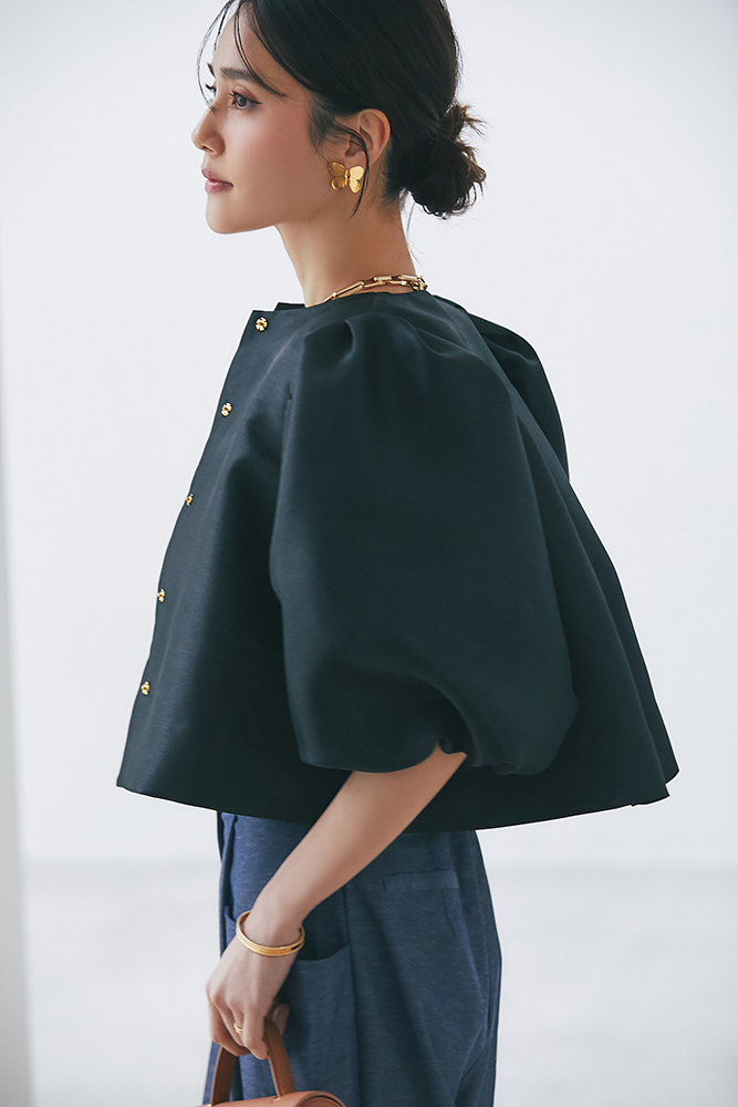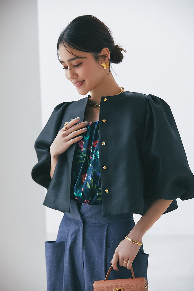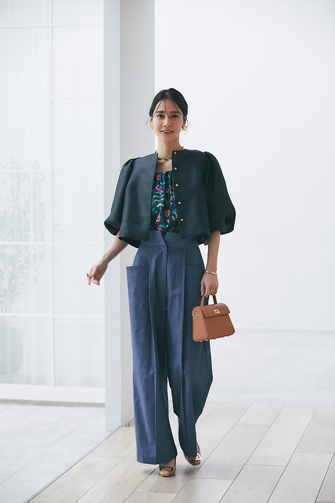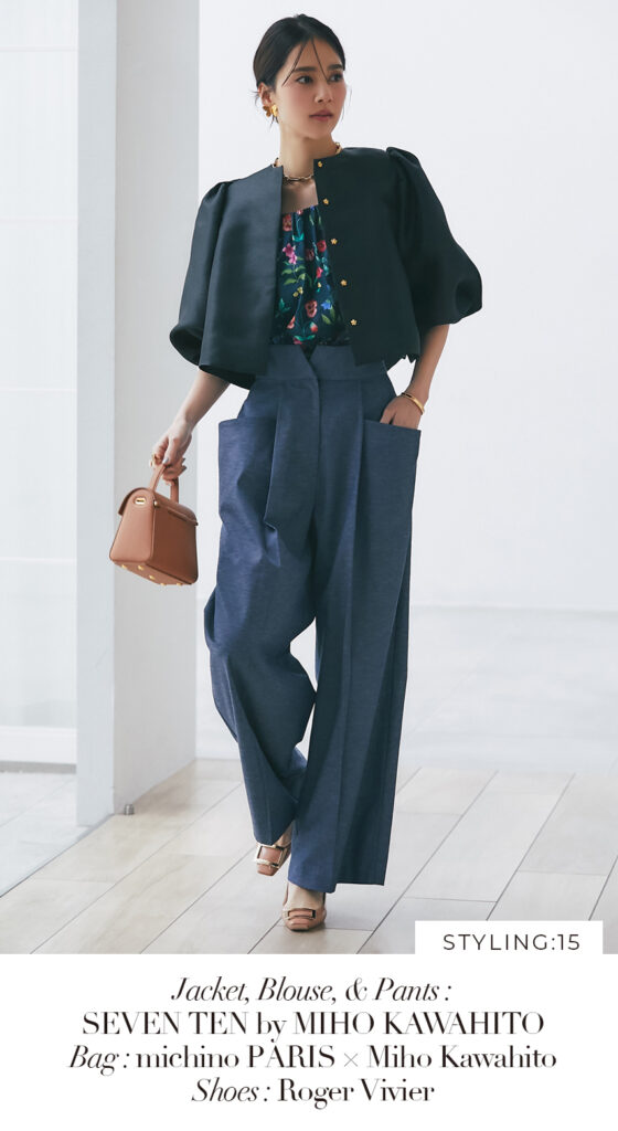 15 ミカドサテンショートジャケット(ブラック) ¥38,500 / リバティフローラルバルーンブラウス(ネイビー) ¥37,400 / タックポケットワイドパンツ(デニム) ¥33,000 / michino Paris × Miho Kawahito コラボレーションバッグ Palais Royal(キャメル) ¥199,000