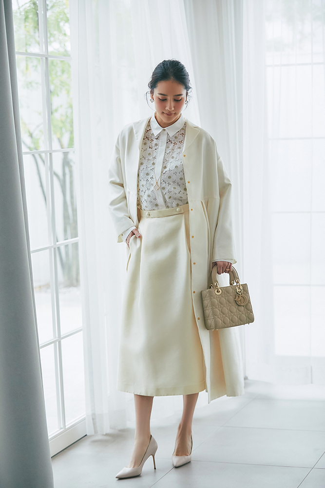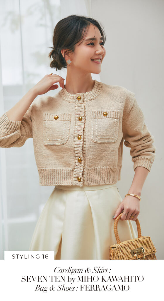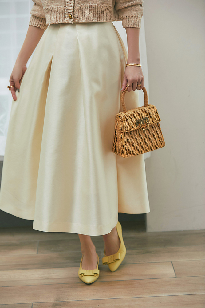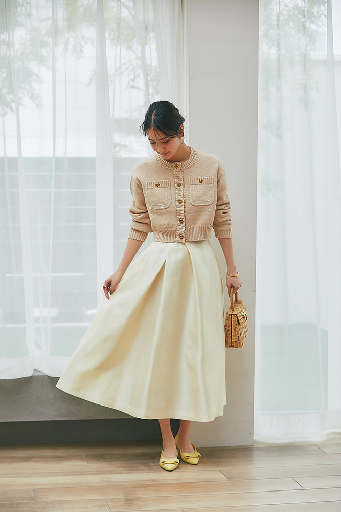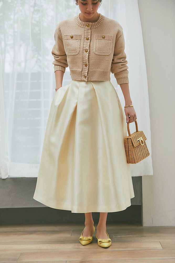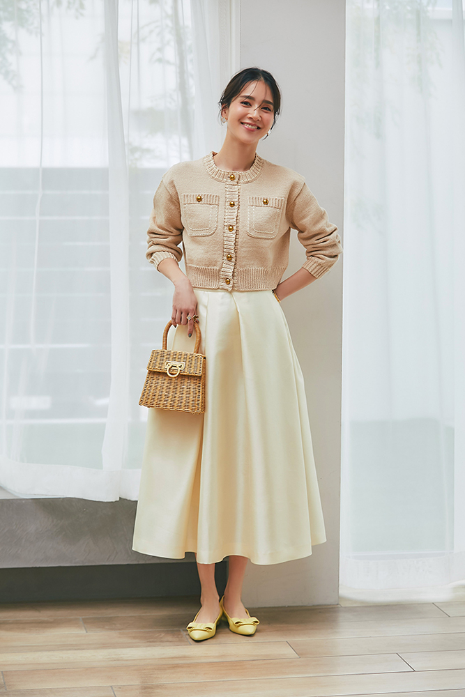 16 ハンドステッチカーディガン(ベージュ) ¥39,600 / ミカドサテンフレアスカート(ペールイエロー) ¥33,000
