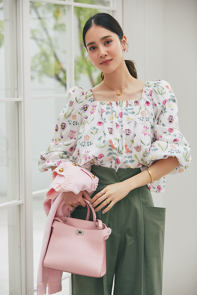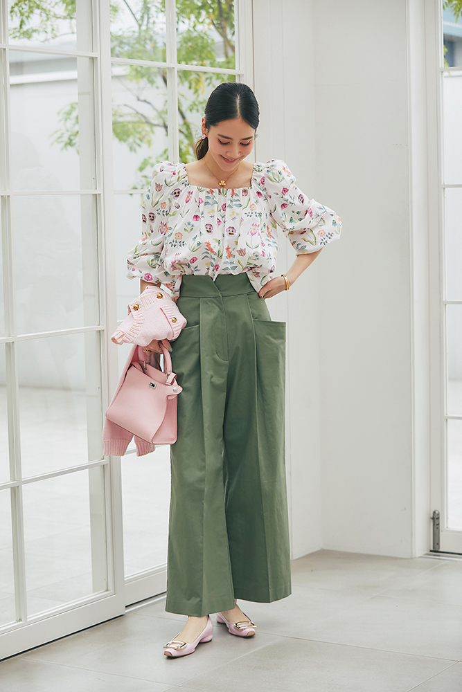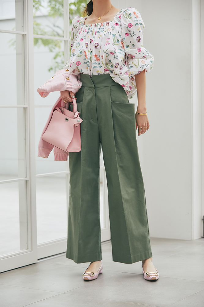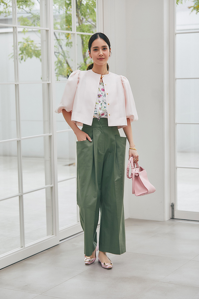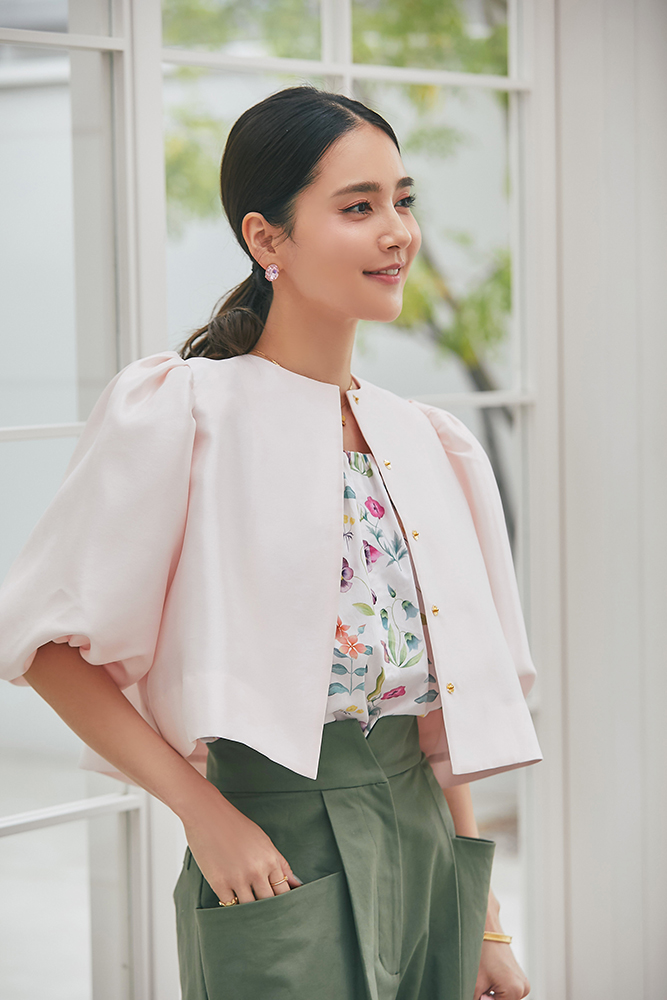 17 ミカドサテンショートジャケット(ペールピンク) ¥38,500 / リバティフローラルバルーンブラウス(ピンク) ¥37,400 / タックポケットワイドパンツ(カーキ) ¥33,000