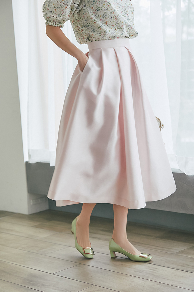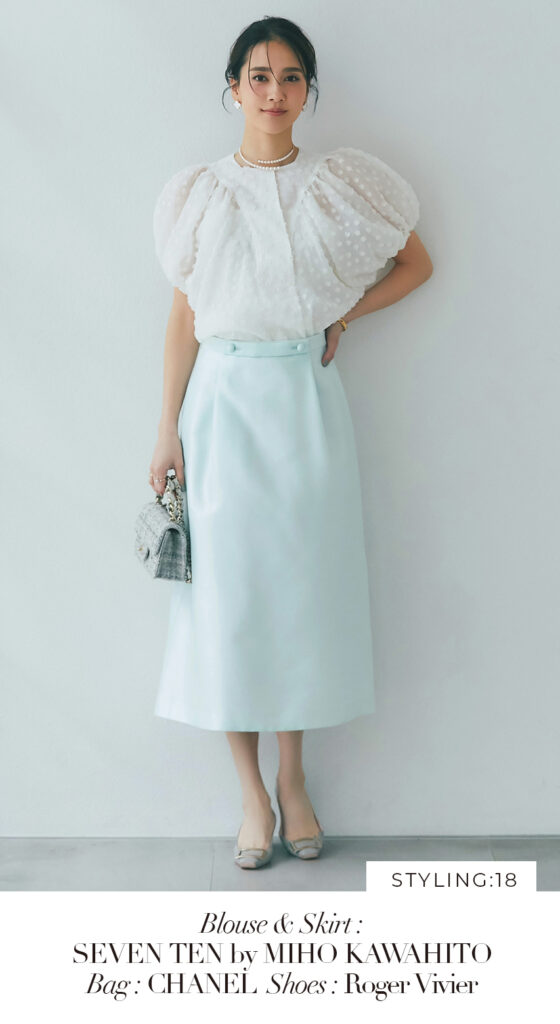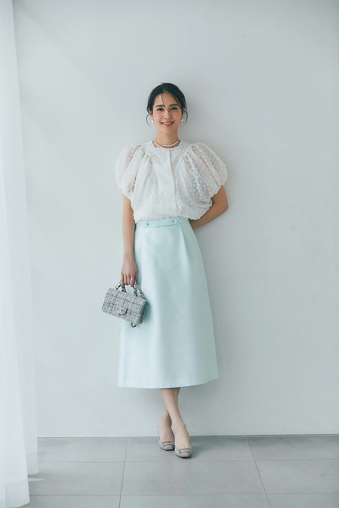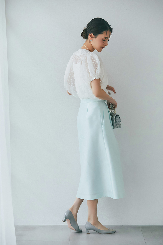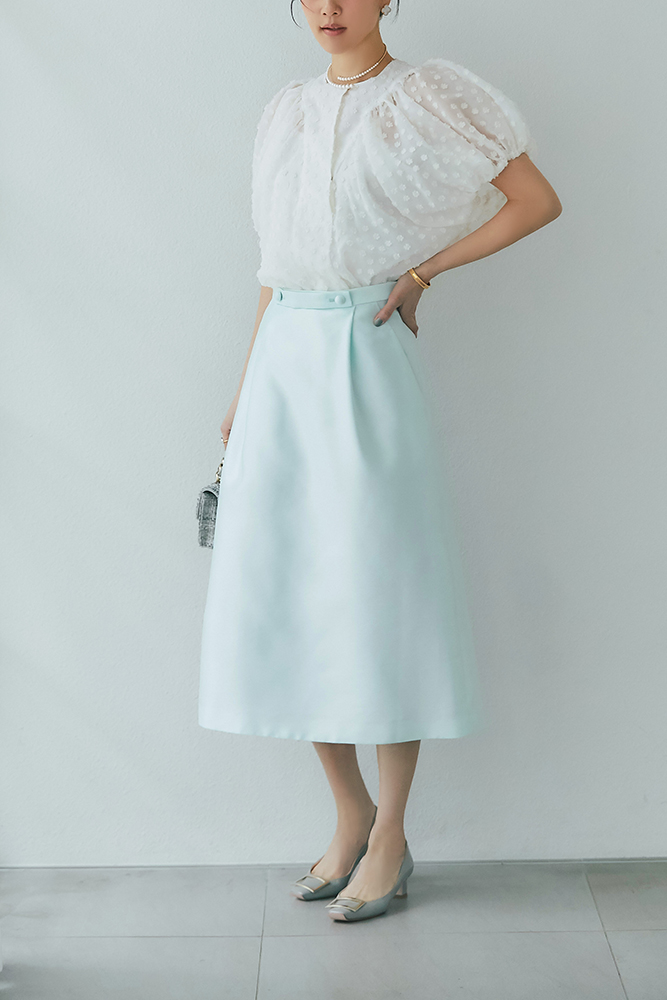 18 ミカドサテンタックタイトスカート(ミント) ¥33,000 / ブラウス 3月発売予定