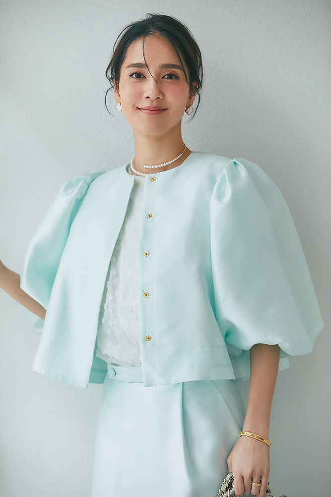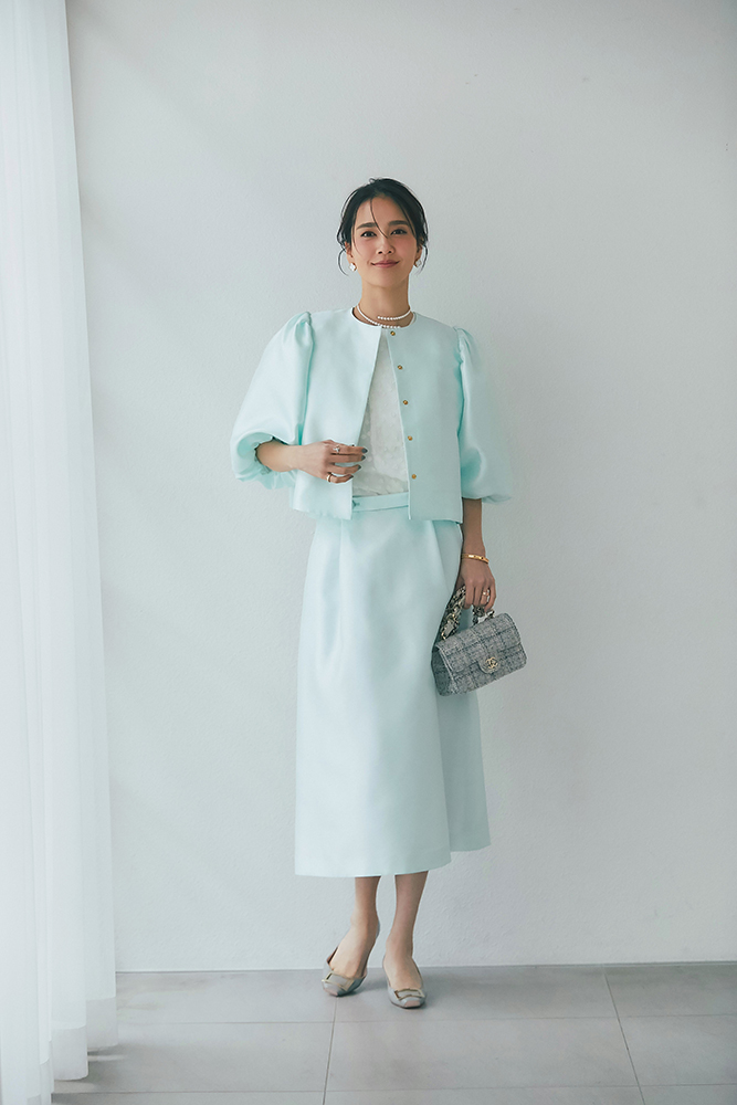 19 ミカドサテンショートジャケット(ミント) ¥38,500 / ミカドサテンタックタイトスカート(ミント) ¥33,000 / ブラウス 3月発売予定