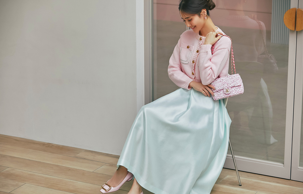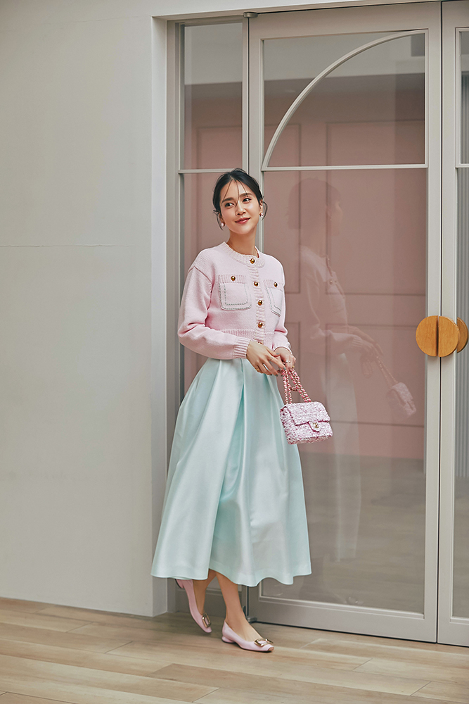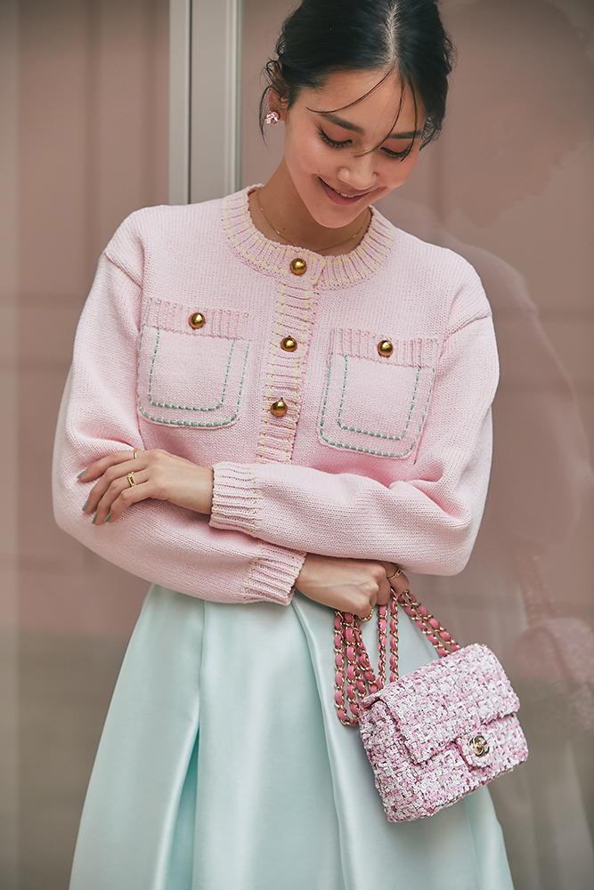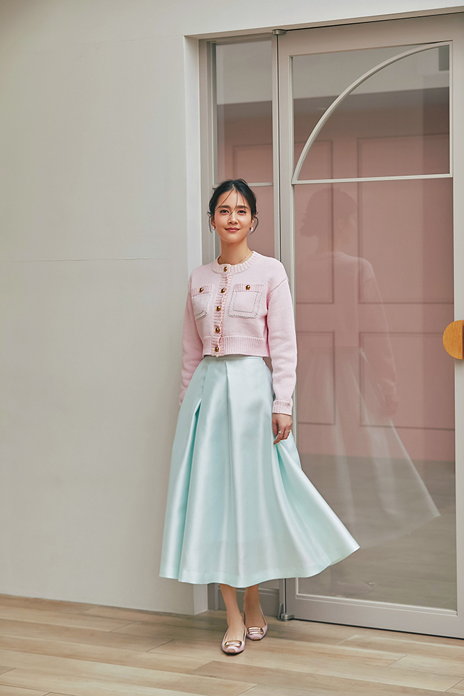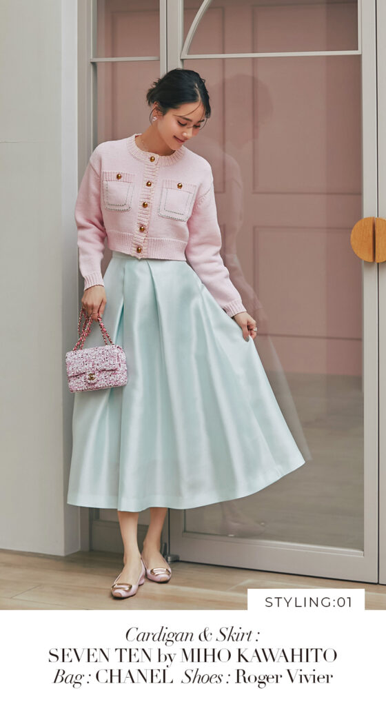 1 ハンドステッチカーディガン(ピンク) ¥39,600 / ミカドサテンフレアスカート(ミント) ¥33,000