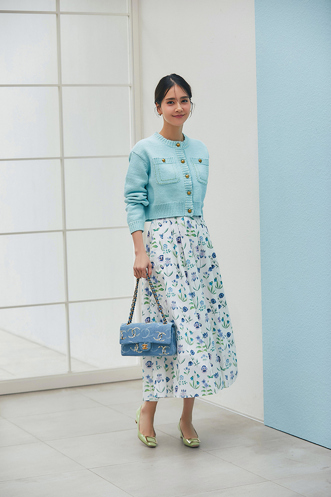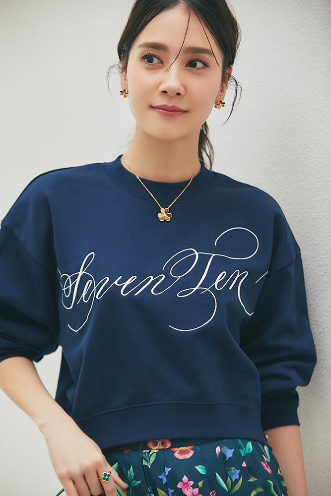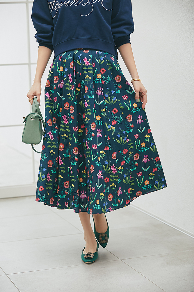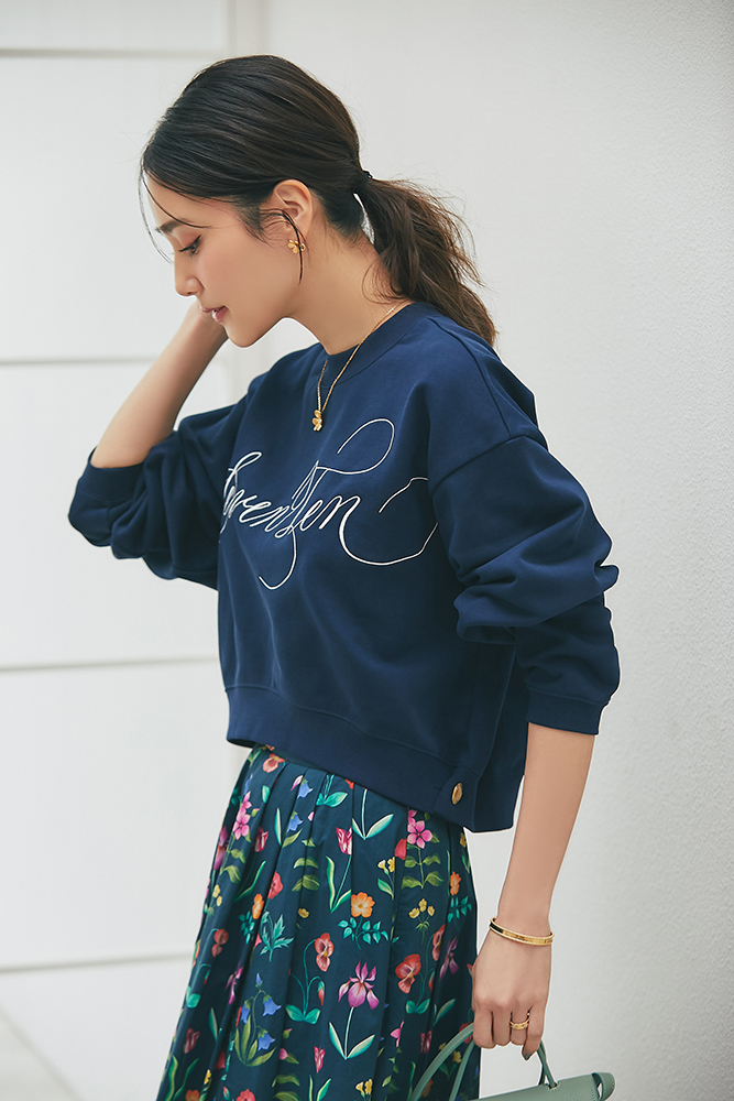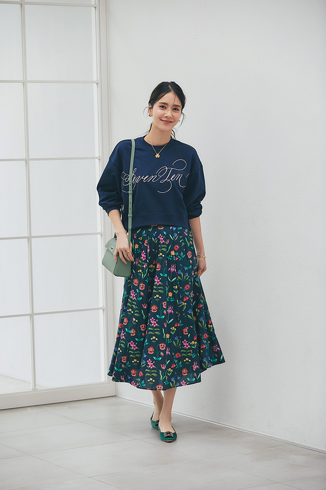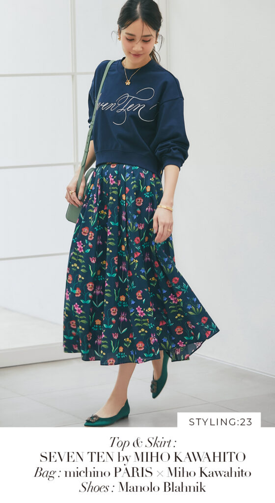 23 カリグラフィ刺繍スウェット(ネイビー×ホワイト) ¥26,400 / リバティフローラルタックスカート(ネイビー) ¥39,600 / michinoPARIS×MIHOKAWAHITOコラボレーションバッグ“Palais Royal”(ミント) ¥199,000