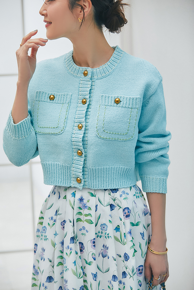 20 ハンドステッチカーディガン(ライトブルー) ¥39,600 / リバティフローラルタックスカート(ブルー) ¥39,600