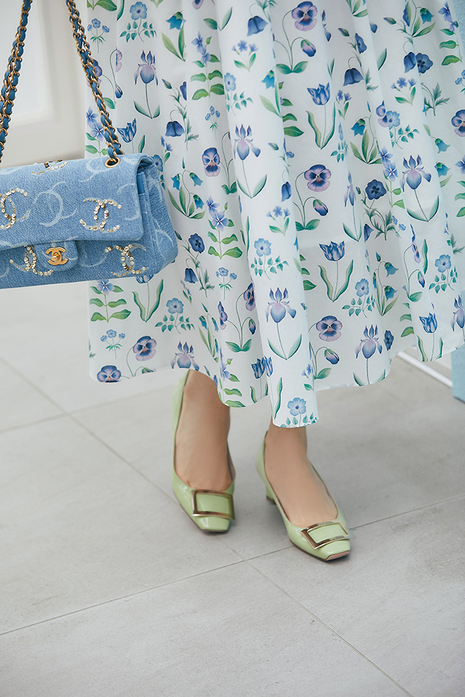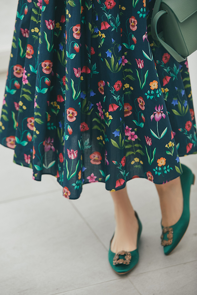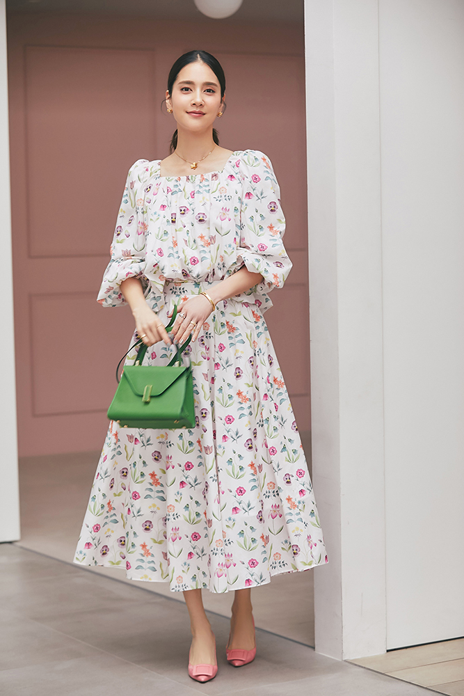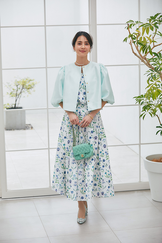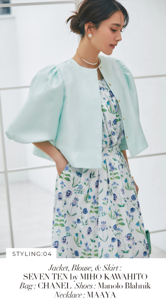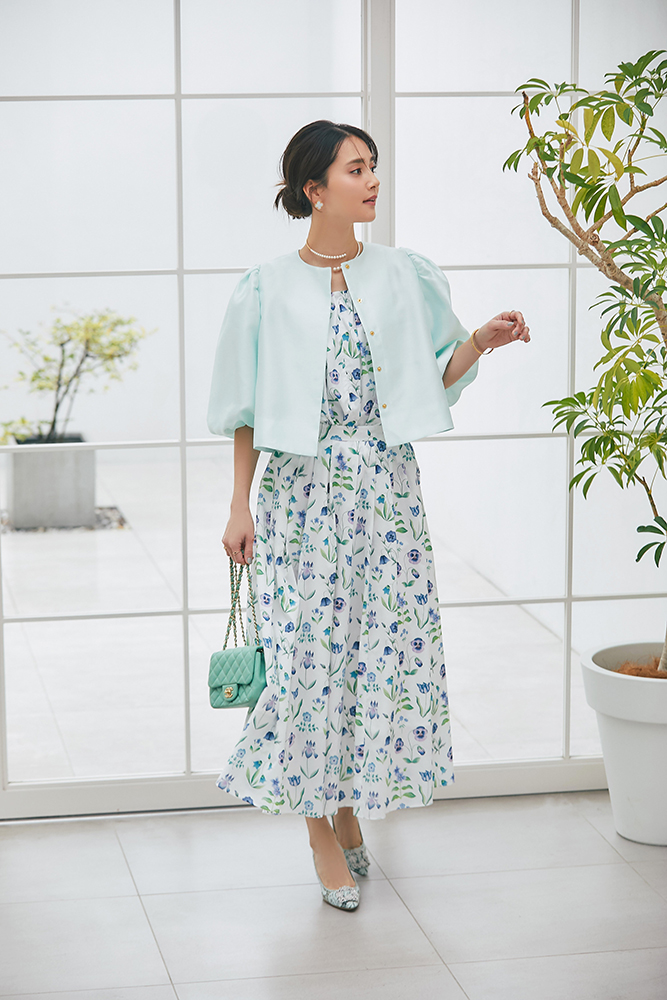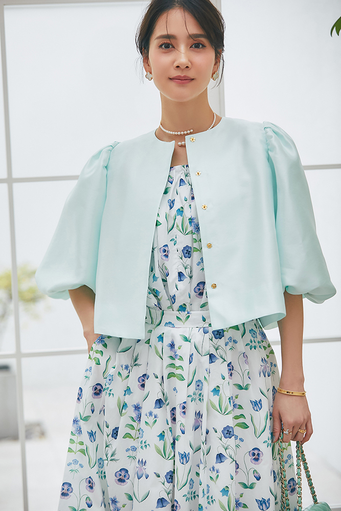4 ミカドサテンショートジャケット(ミント) ¥38,500 / リバティフローラルバルーンブラウス(ブルー) ¥37,400 / リバティフローラルタックスカート(ブルー) ¥39,600