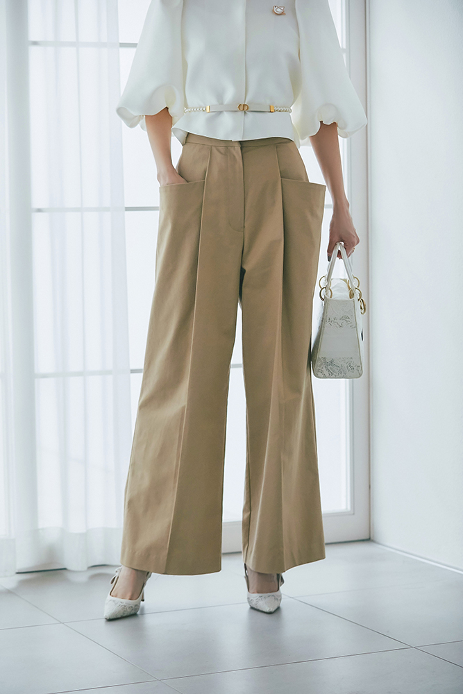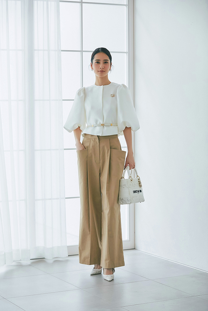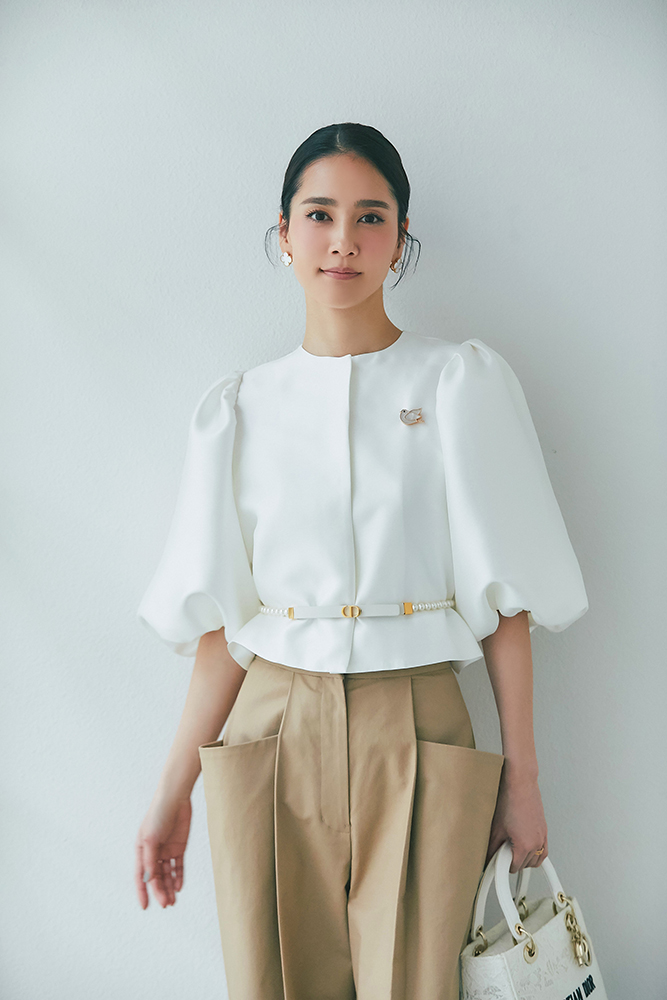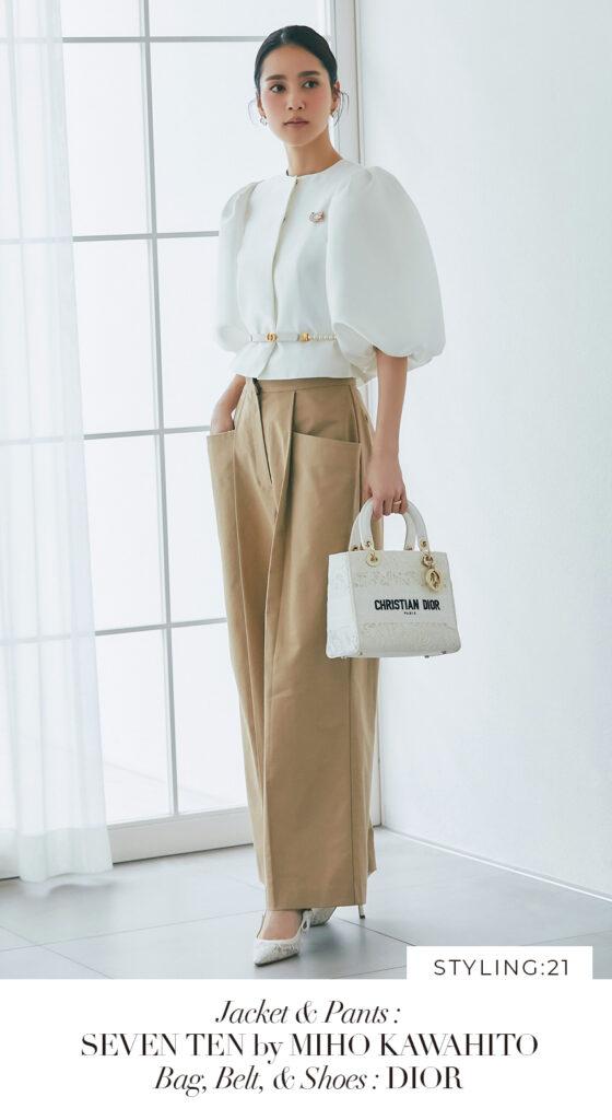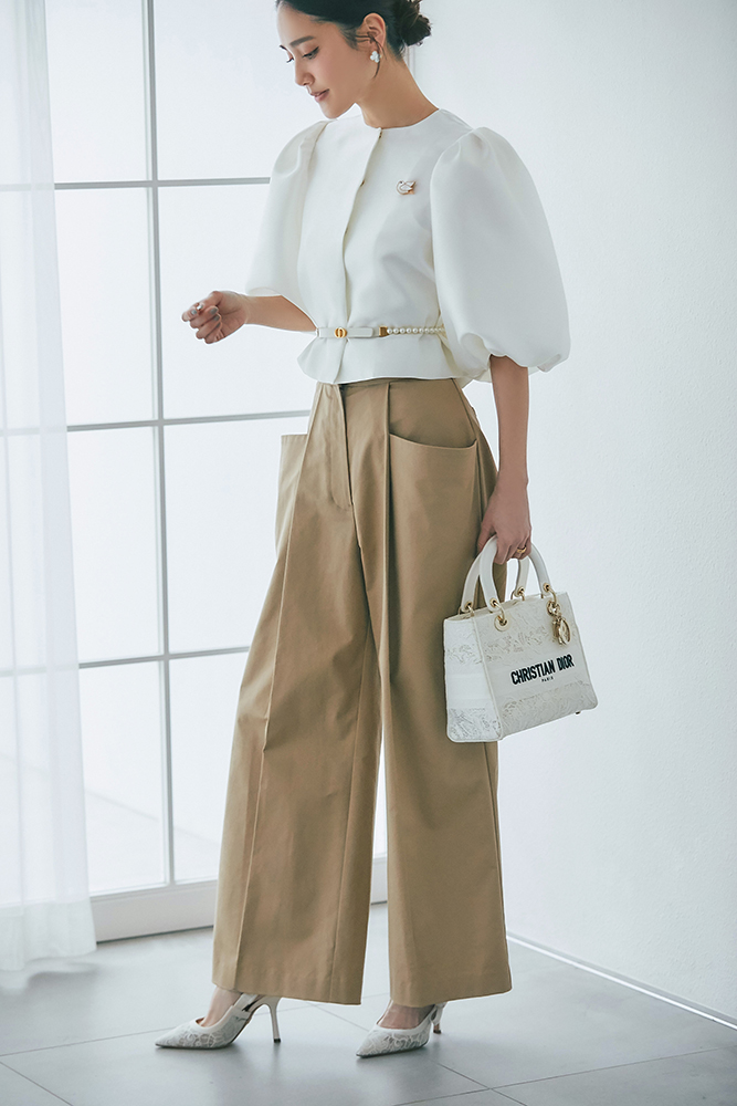 21 ミカドサテンショートジャケット(オフホワイト) ¥38,500 / タックポケットワイドパンツ(ベージュ) ¥33,000