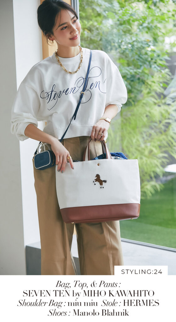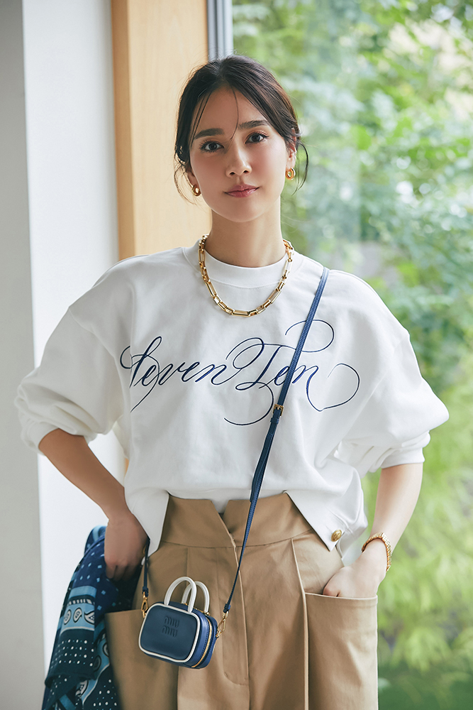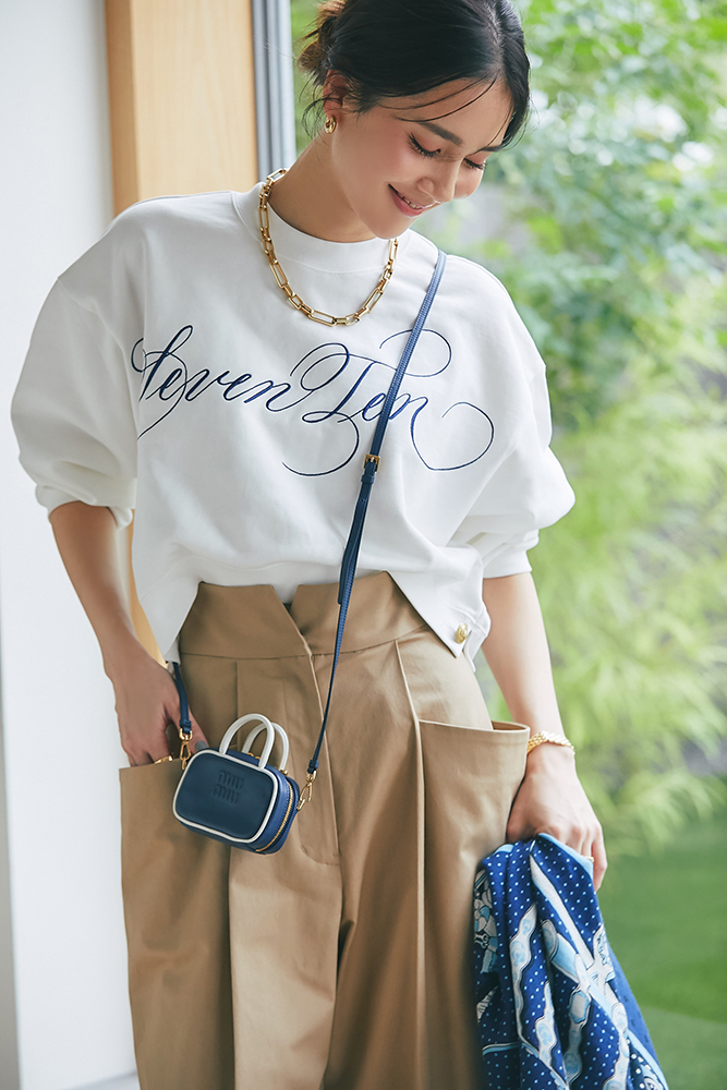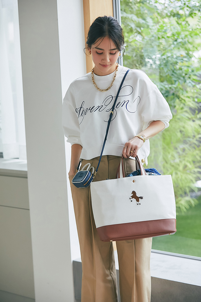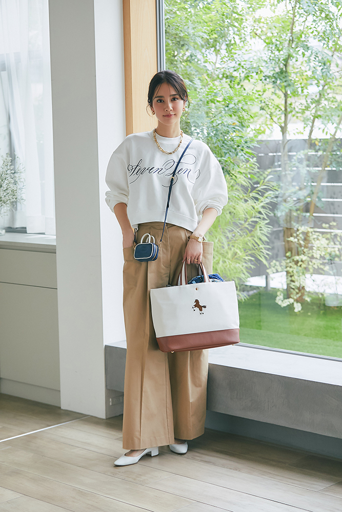 24 カリグラフィ刺繍スウェット(ホワイト×ネイビー) ¥26,400 / タックポケットワイドパンツ(ベージュ) / ワンポイント刺繍バッグ(オフホワイト) ¥19,800