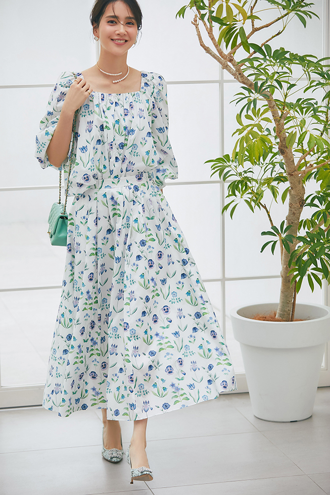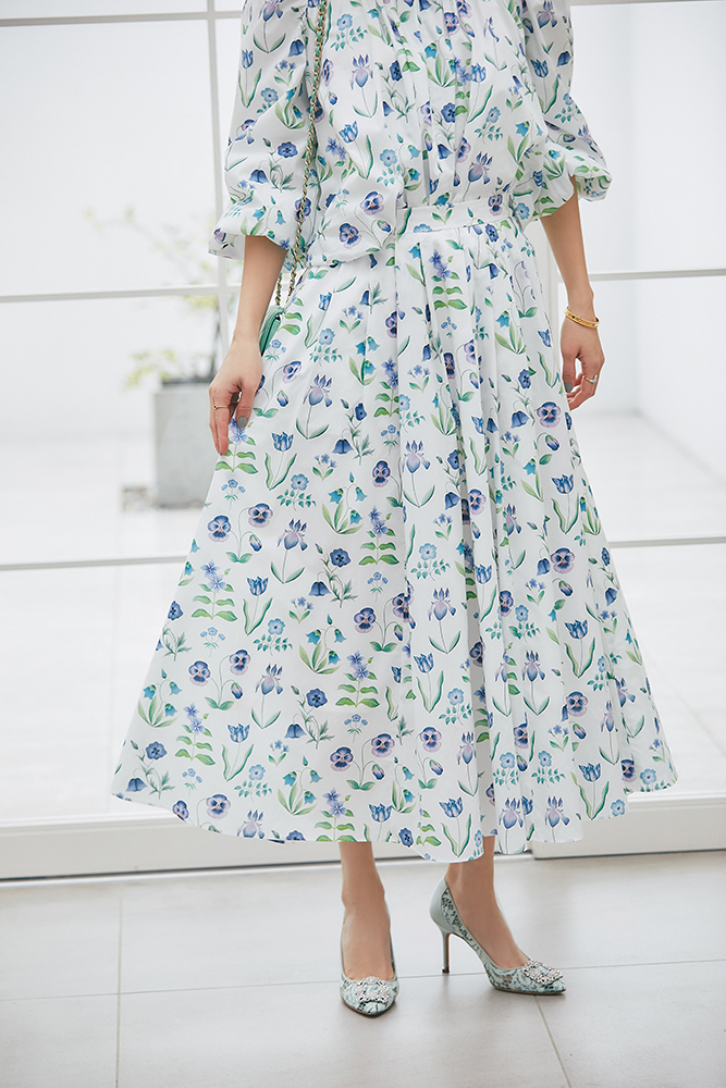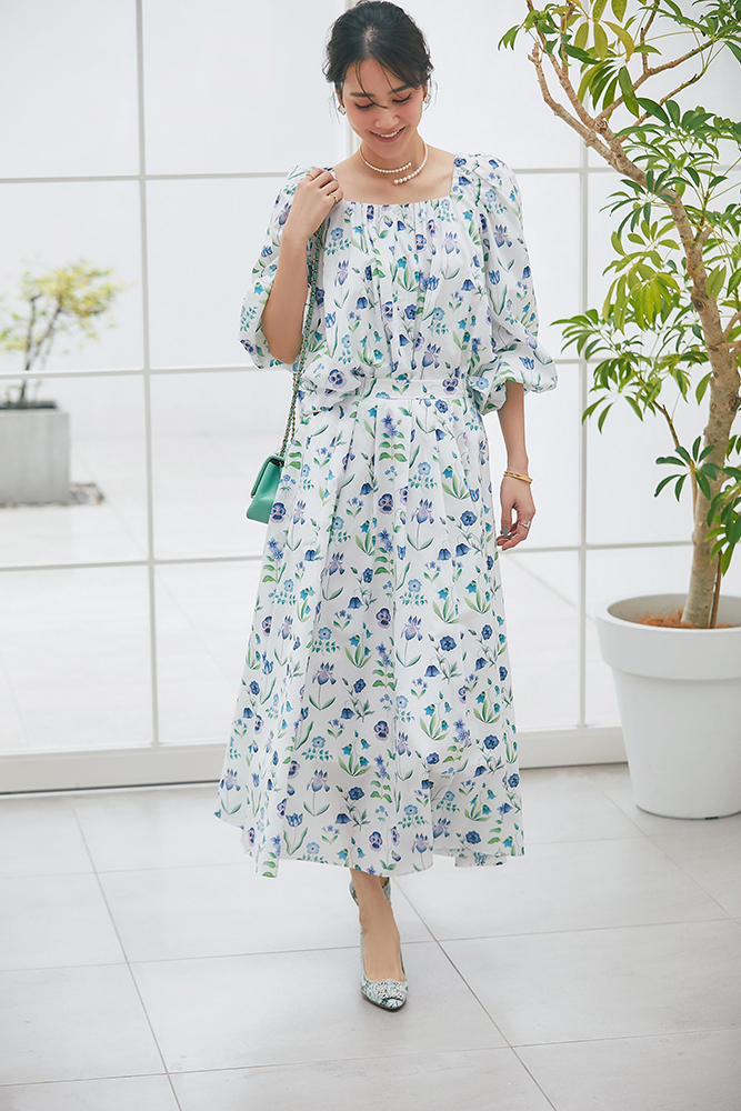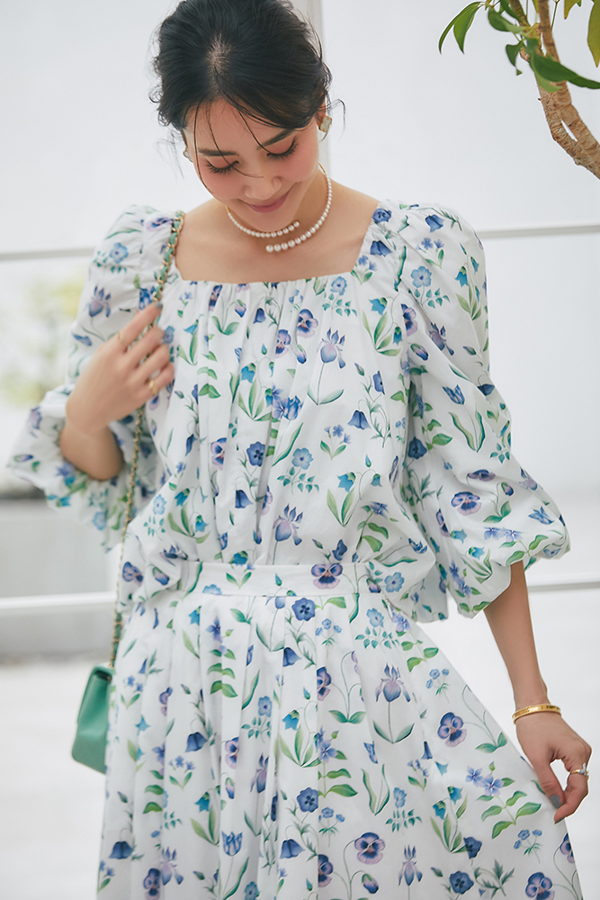3 リバティフローラルバルーンブラウス(ブルー) ¥37,400 / リバティフローラルタックスカート(ブルー) ¥39,600