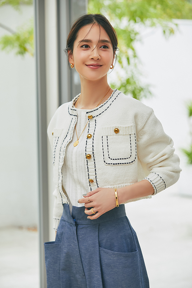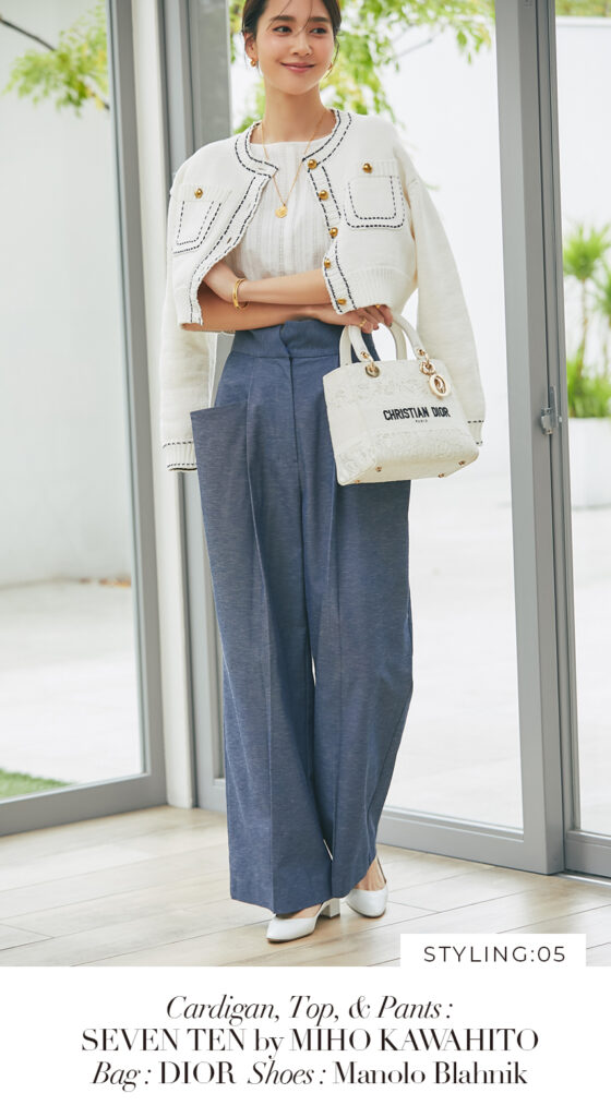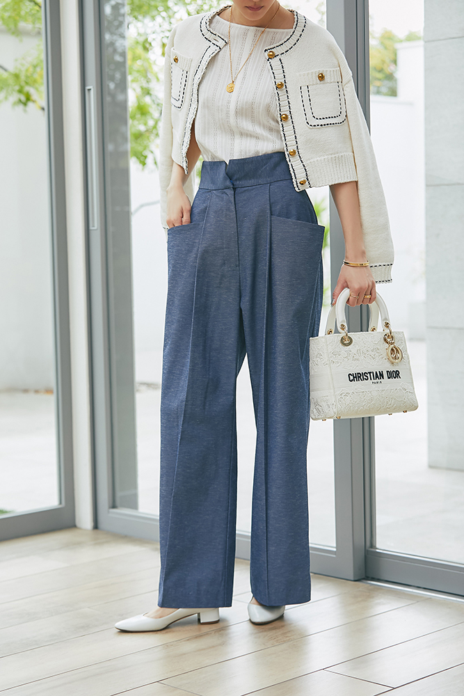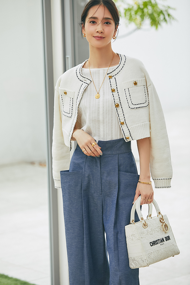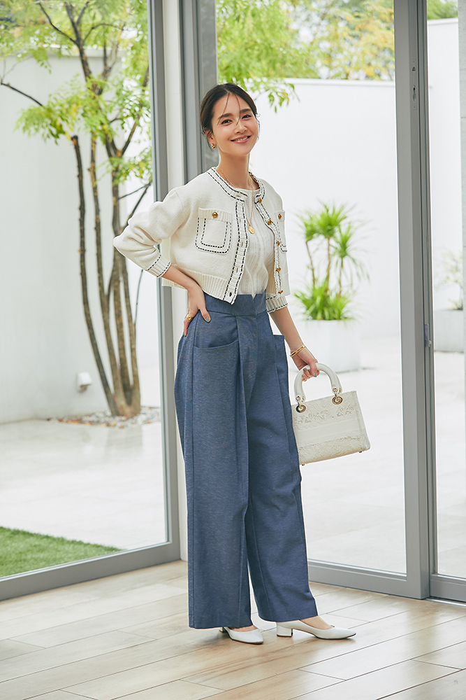 5 ハンドステッチカーディガン(オフホワイト) ¥39,600 / タックポケットワイドパンツ(デニム) ¥33,000 / トップス 参考商品