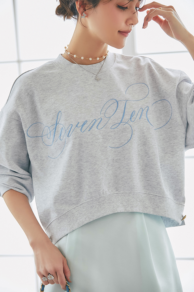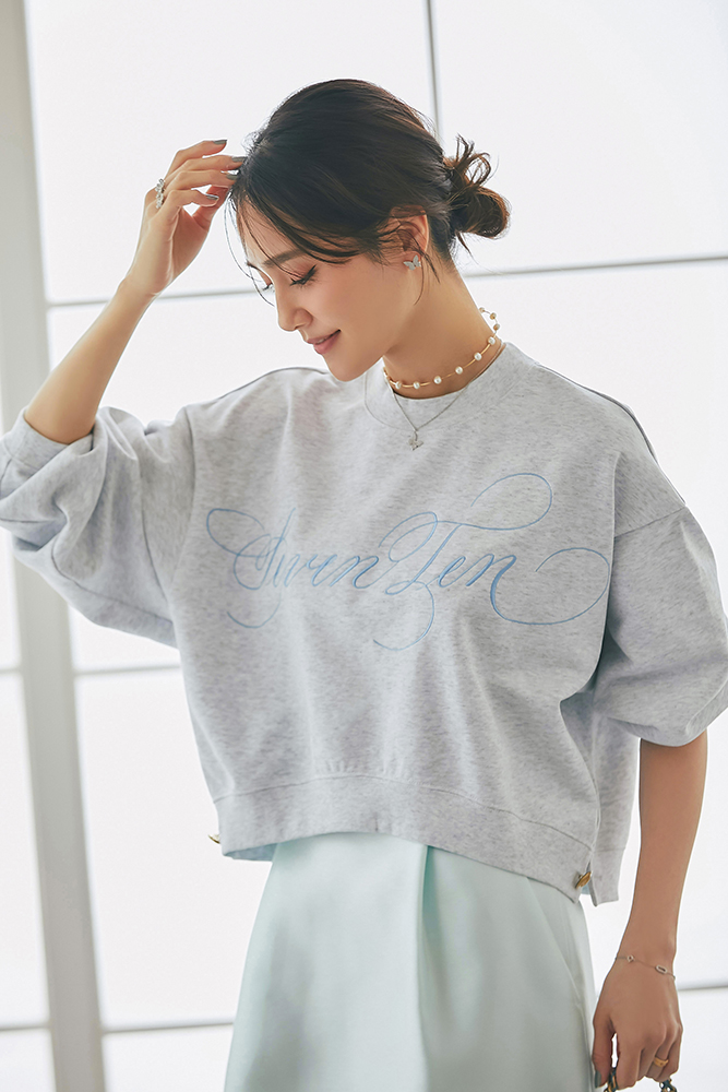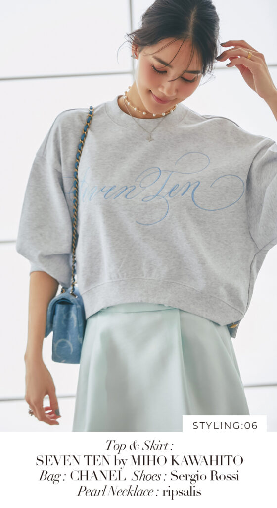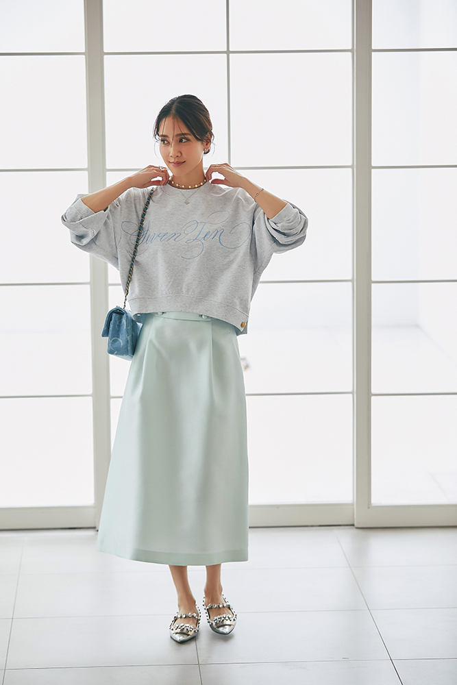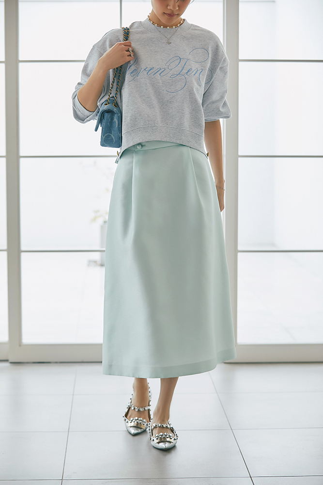 6 カリグラフィ刺繍スウェット(ライトグレー) ¥26,400 / ミカドサテンタックタイトスカート(ミント) ¥33,000