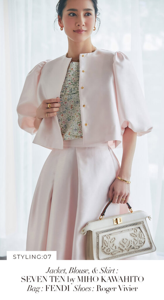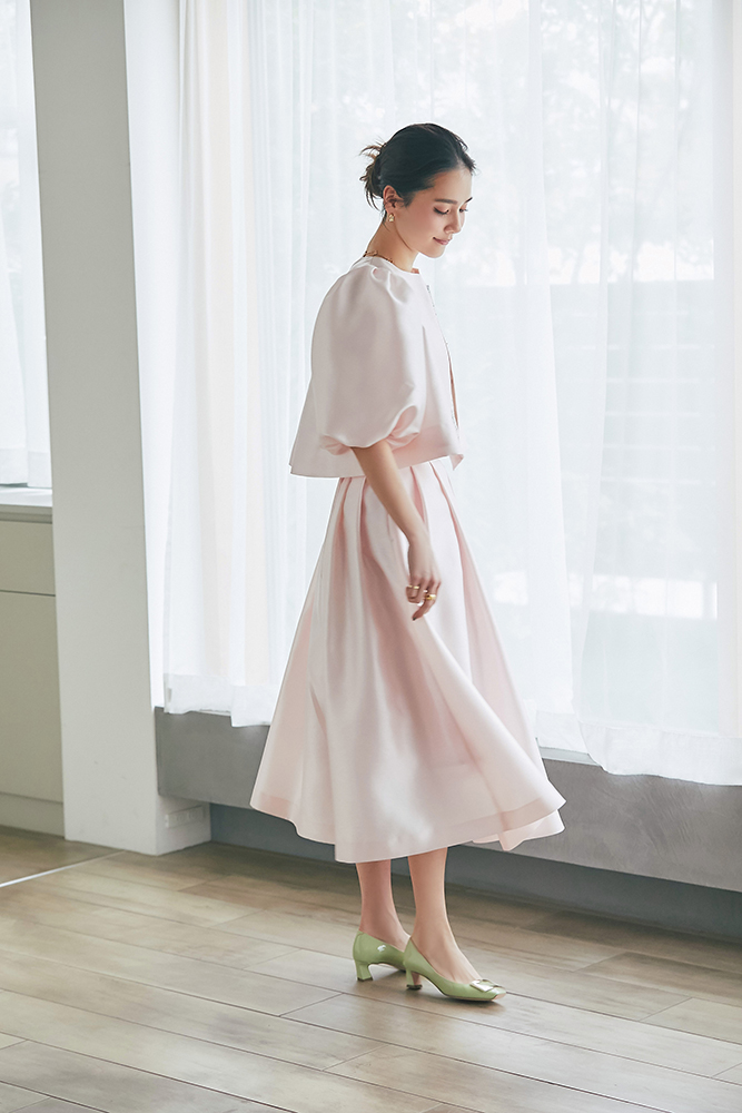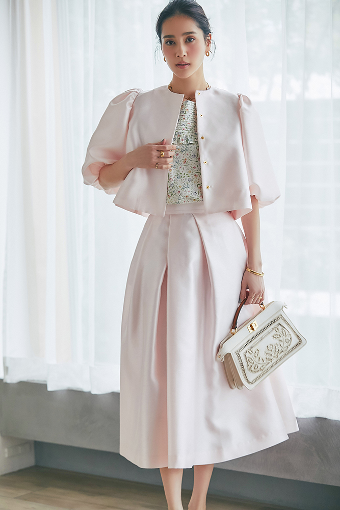 7 ミカドサテンショートジャケット(ペールピンク) ¥38,500 / ミカドサテンフレアスカート(ペールピンク) ¥33,000 / ブラウス 3月発売予定