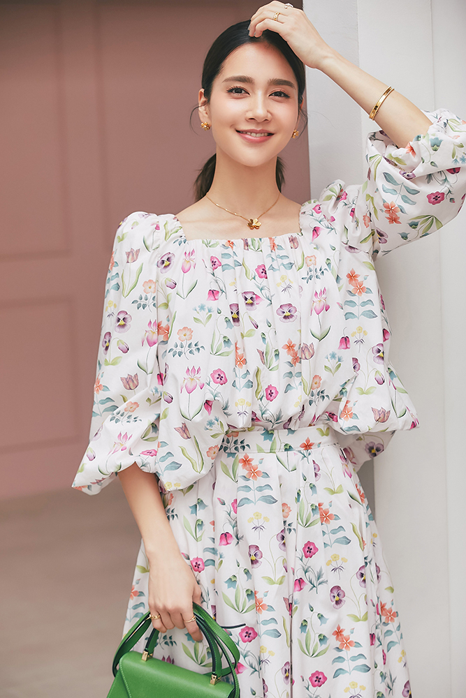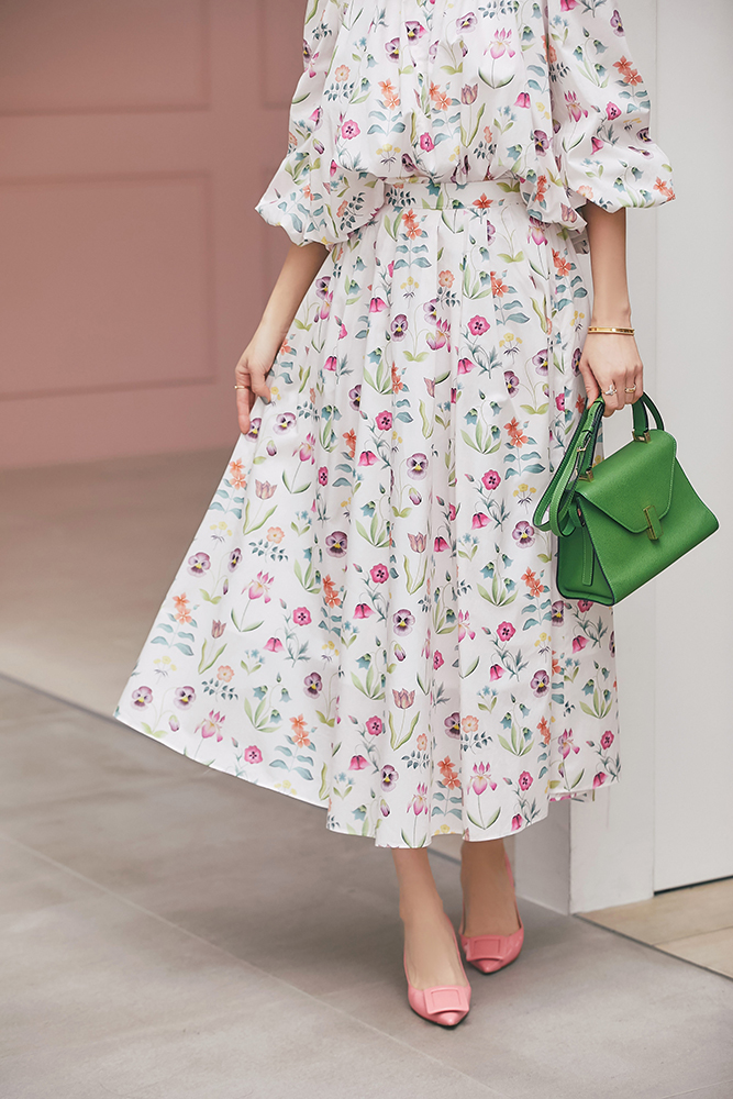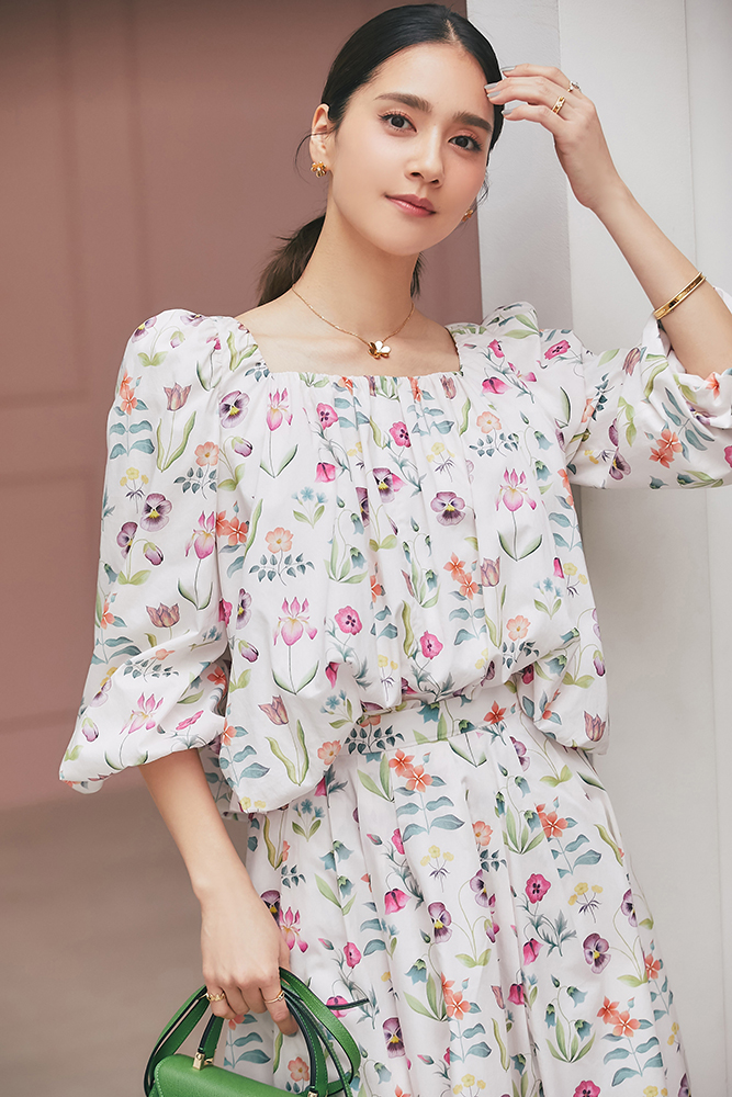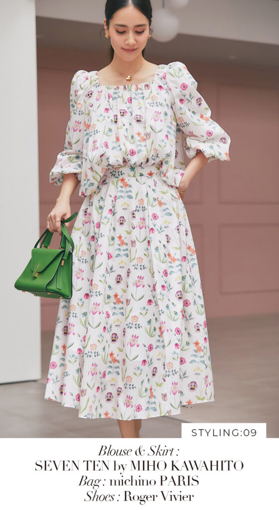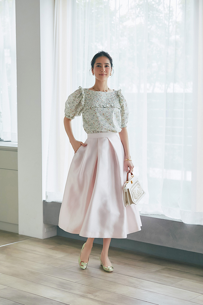 9 リバティフローラルバルーンブラウス(ピンク) ¥37,400 / リバティフローラルタックスカート(ピンク) ¥39,600