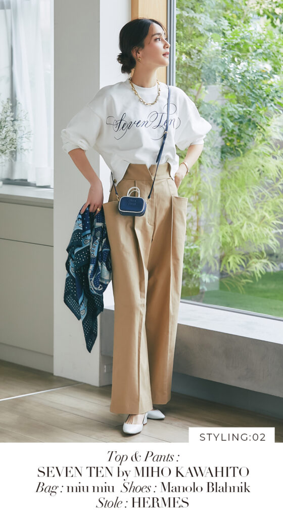 2 カリグラフィ刺繍スウェット(ホワイト×ネイビー) ¥26,400 / タックポケットワイドパンツ(ベージュ) ¥33,000