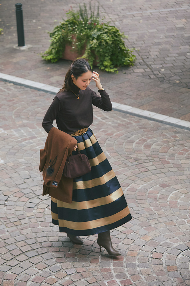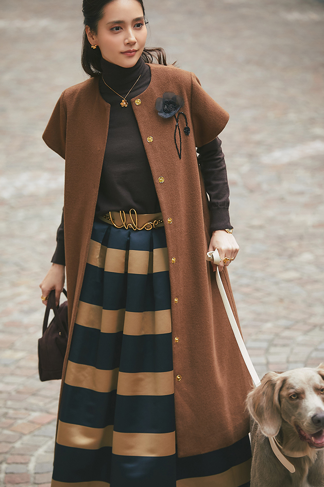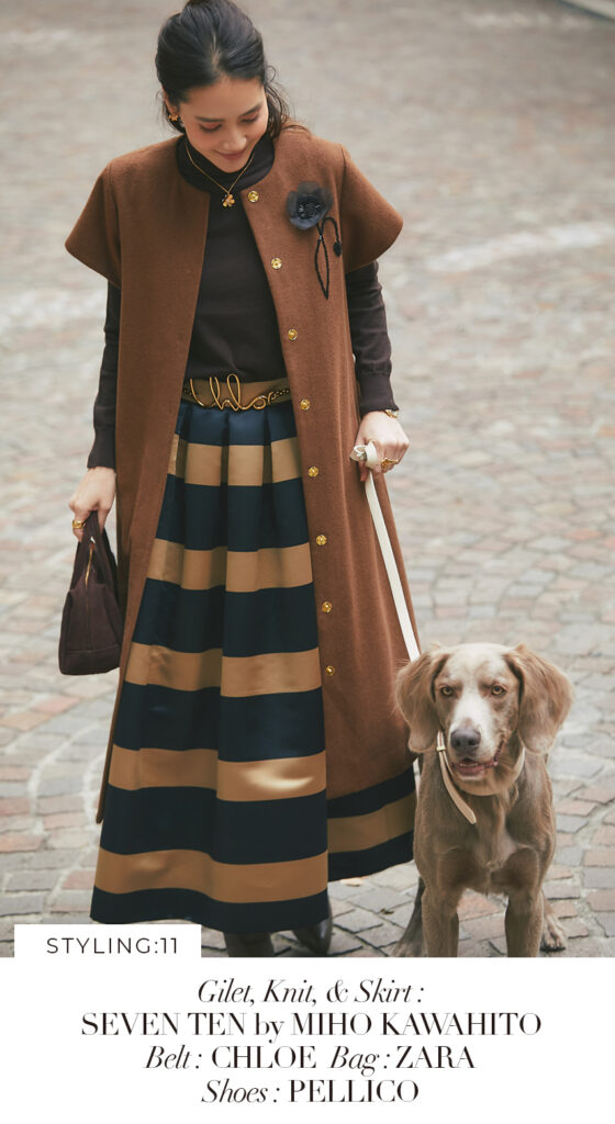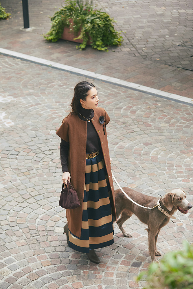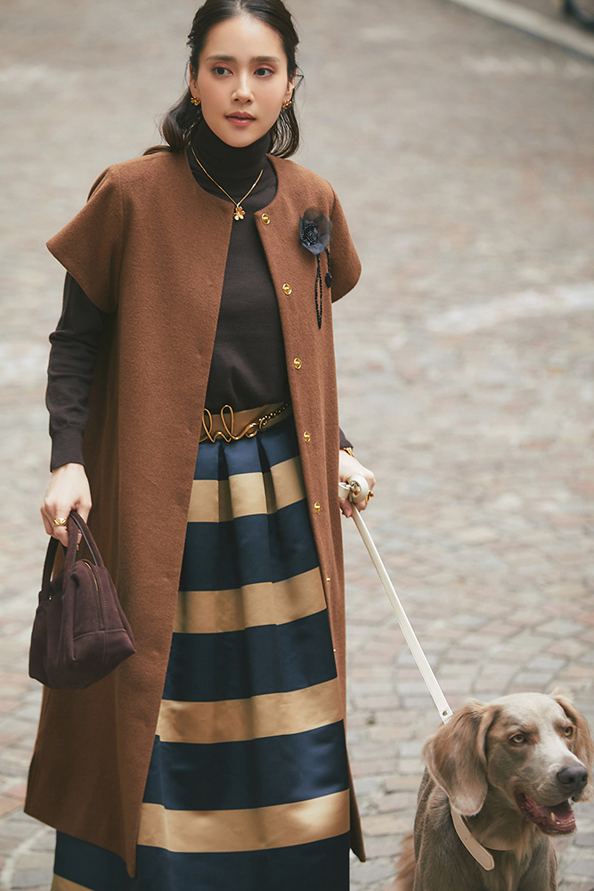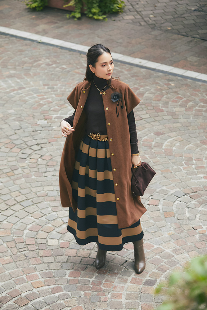 11 モチーフジレワンピース(ブラウン) ¥44,000 / ボーダーサテンスカート(ベージュ×ネイビー) ¥38,500 / ニット 11月発売予定