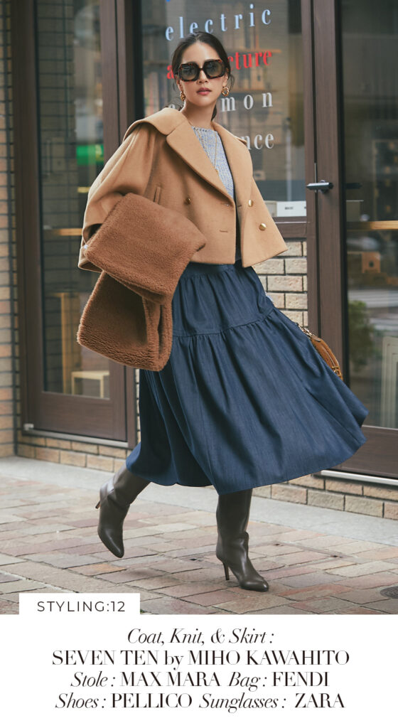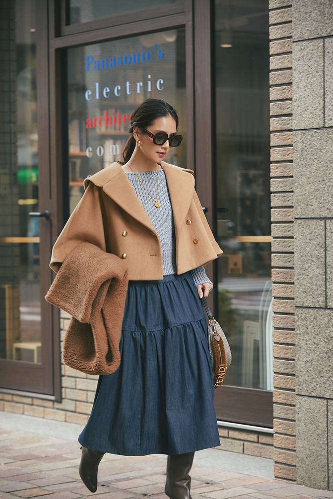 12 ダブルブレストショートコート(キャメル) ¥44,000 / ニット・スカート 11月発売予定
