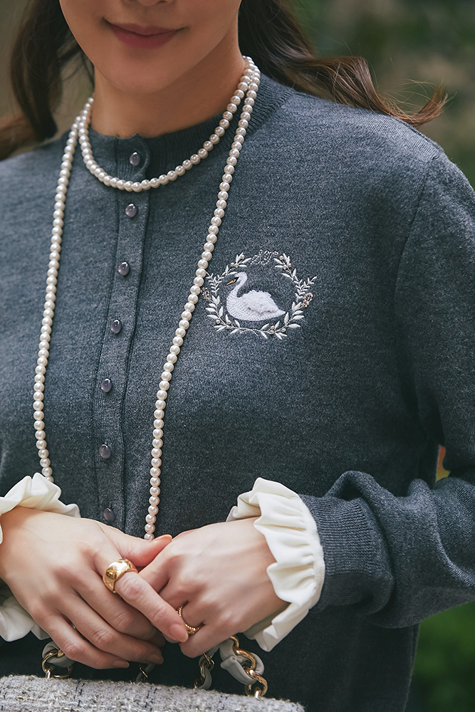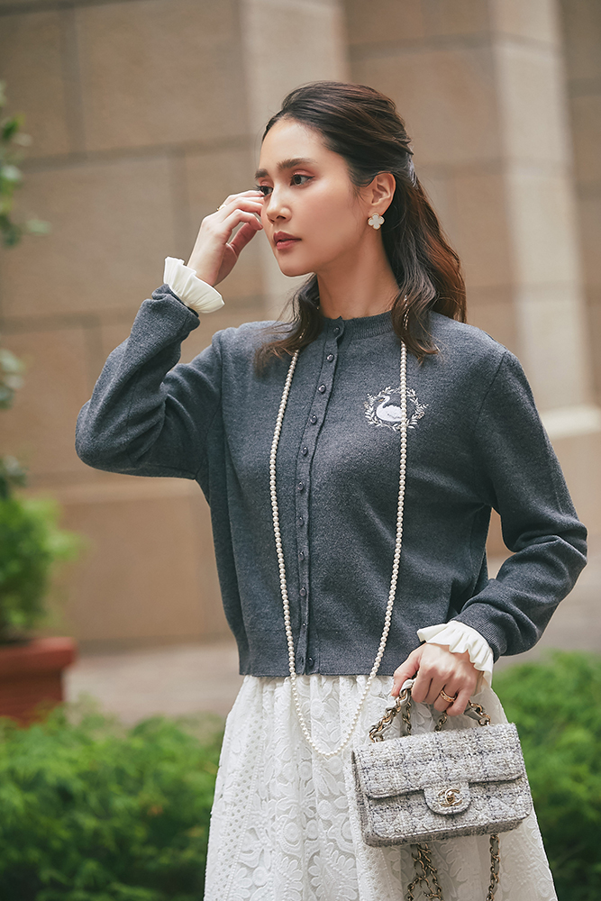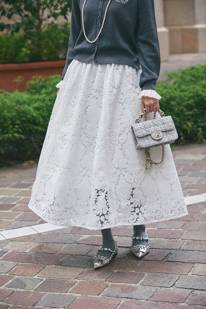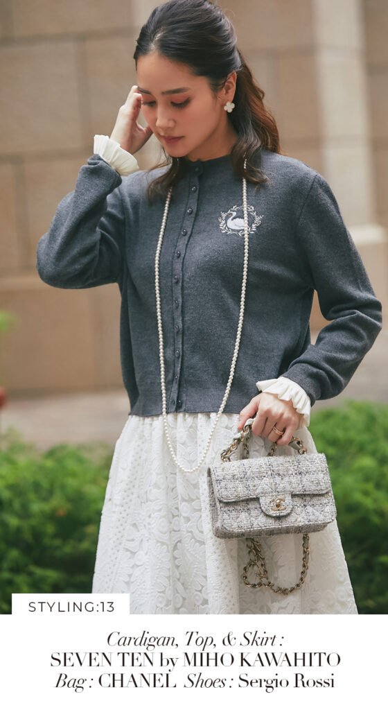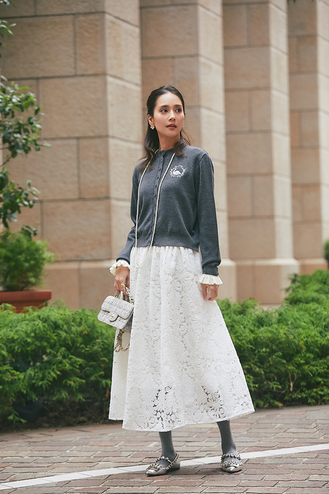 13 ワンポイント刺繍カーディガン(グレー) ¥33,000 / ベロアタッチシアートップス(オフホワイト) ¥26,400 / パネルレーススカート(ホワイト) ¥41,800