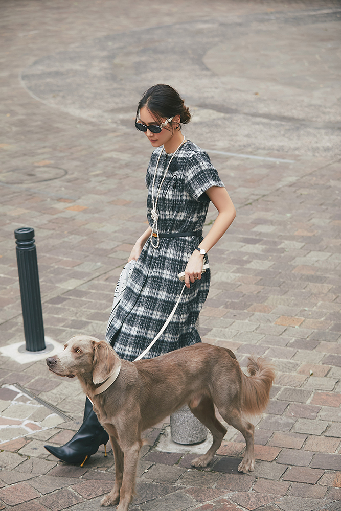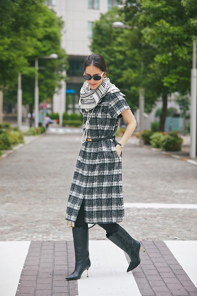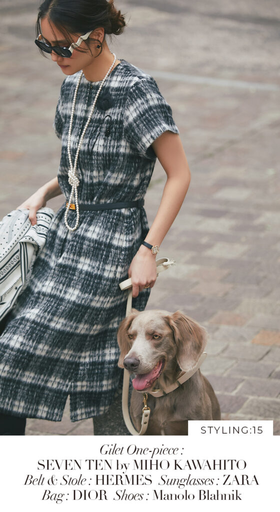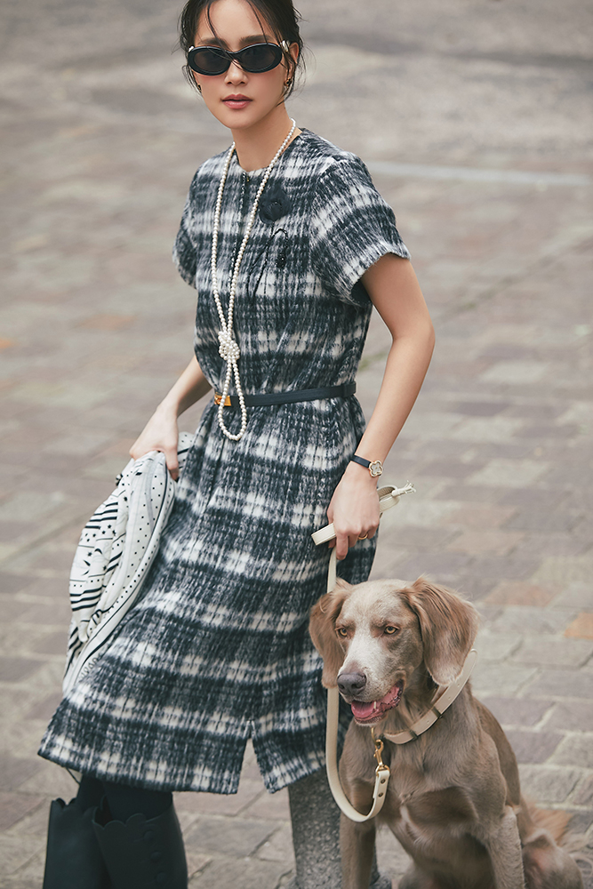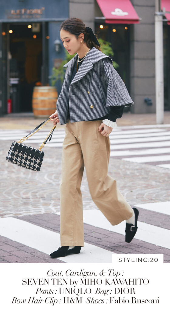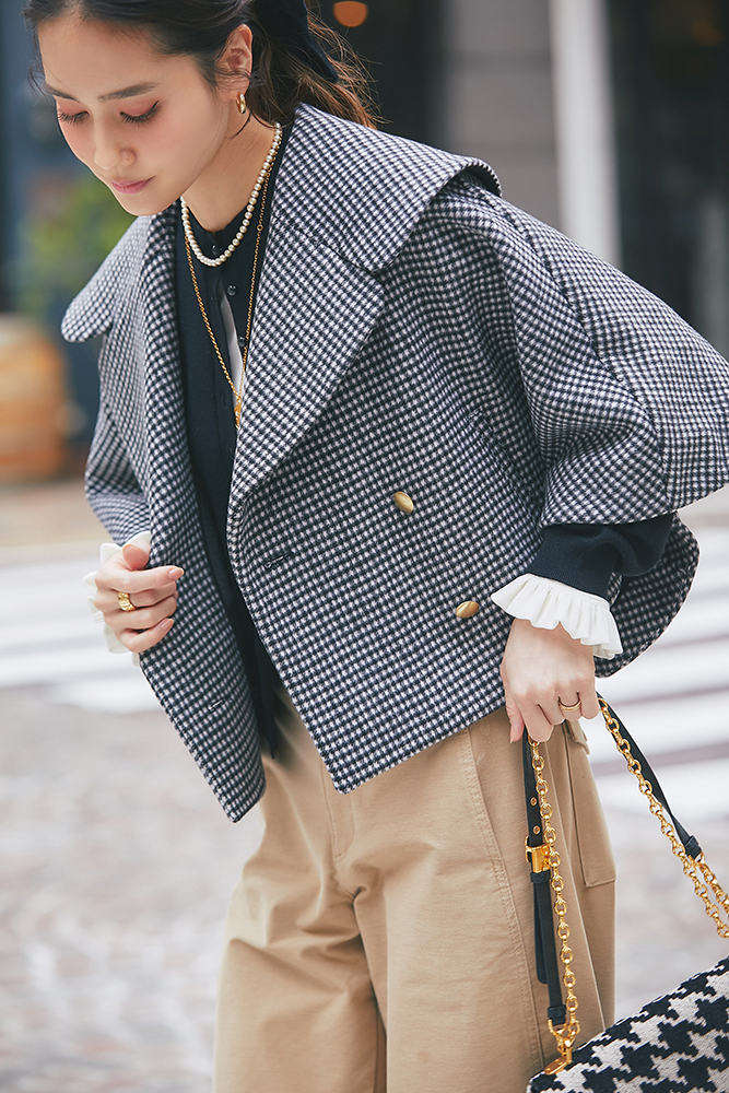 20 ダブルブレストショートコート(チェック) ¥44,000 / ワンポイント刺繍カーディガン(ブラック) ¥33,000 / ベロアタッチシアートップス(オフホワイト) ¥26,400
