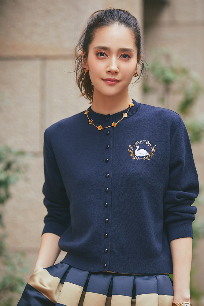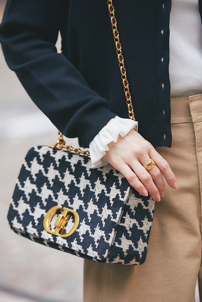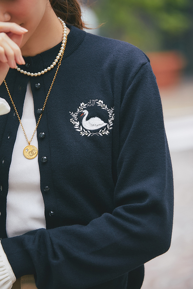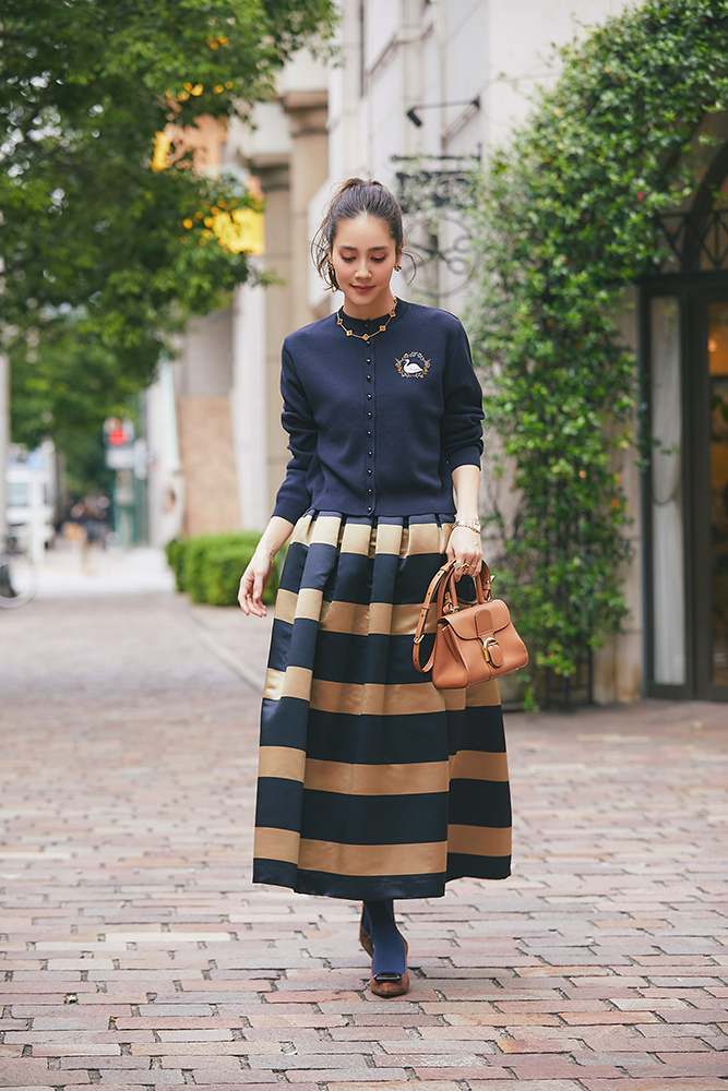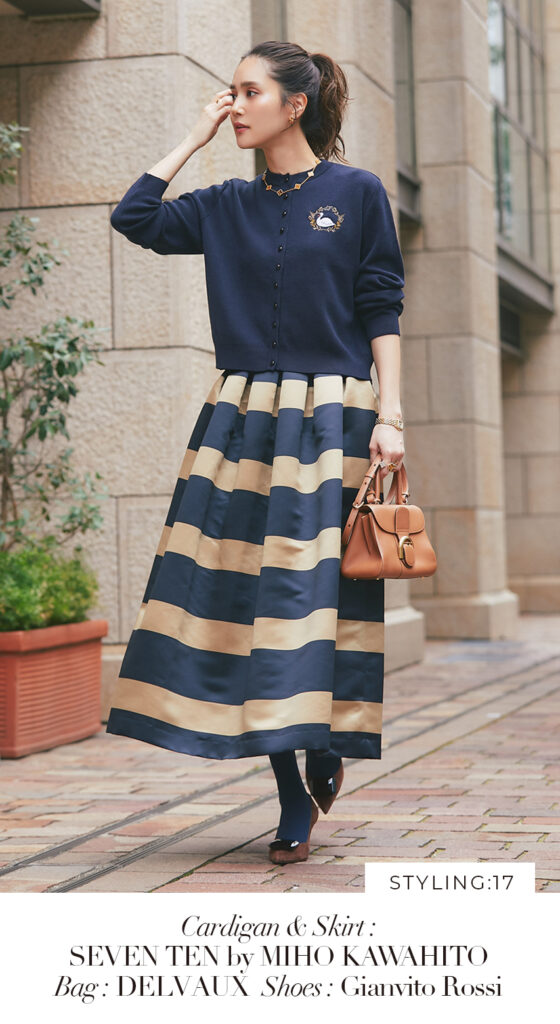 17 ワンポイント刺繍カーディガン(ネイビー) ¥33,000 / ボーダーサテンスカート(ベージュ×ネイビー) ¥38,500