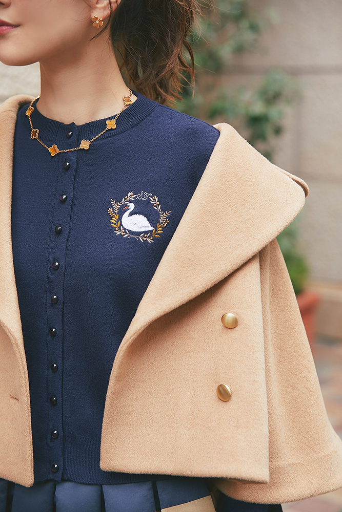 18 ダブルブレストショートコート(キャメル) ¥44,000 / ワンポイント刺繍カーディガン(ネイビー) ¥33,000 / ボーダーサテンスカート(ベージュ×ネイビー) ¥38,500