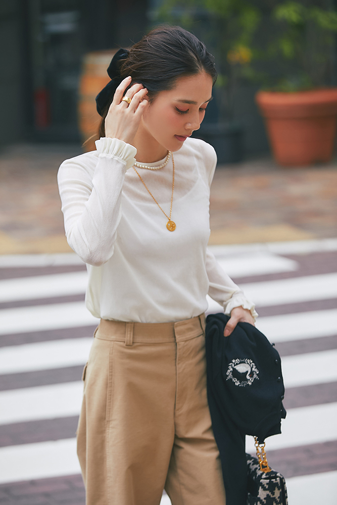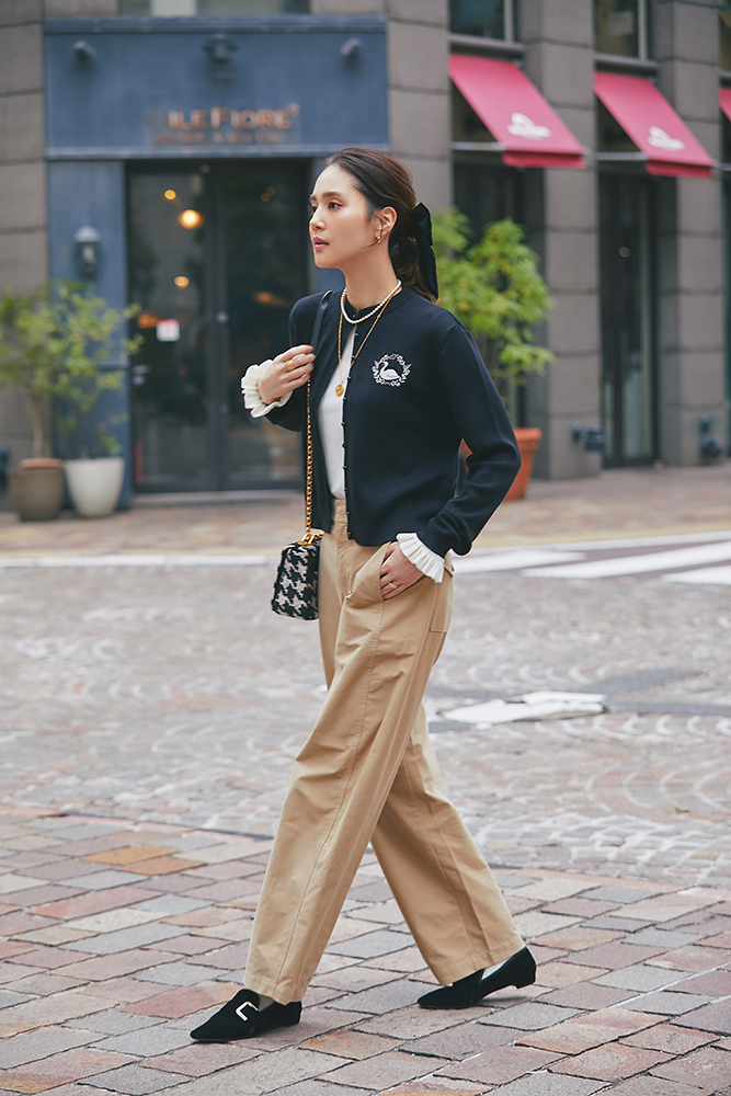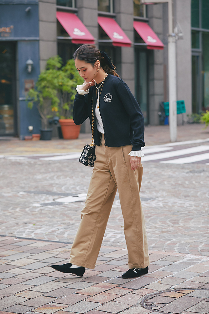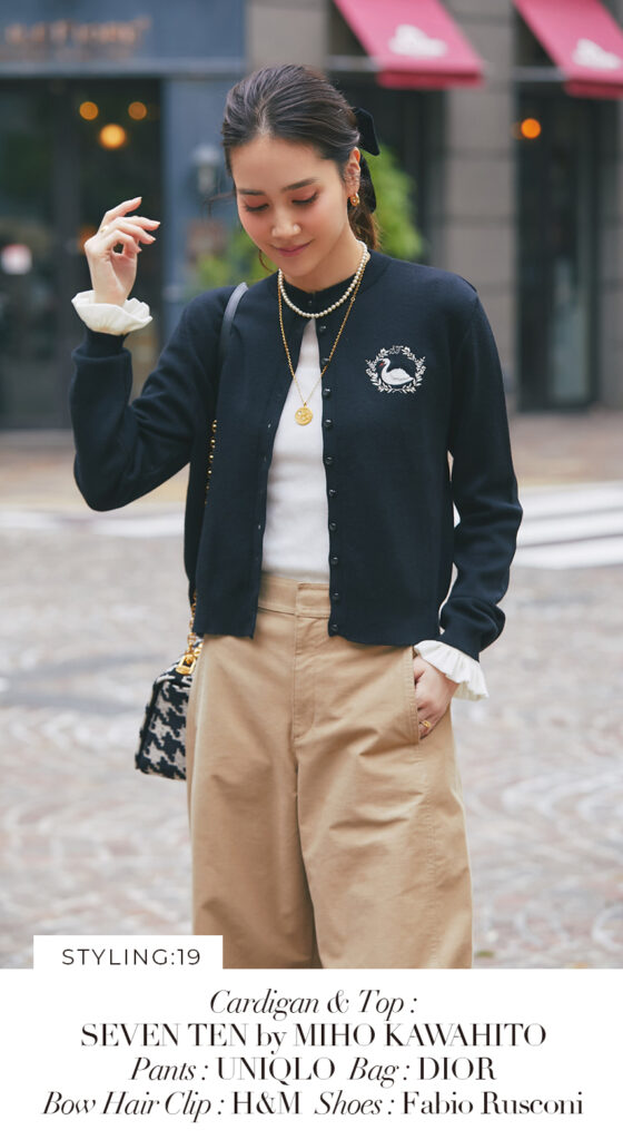 19 ワンポイント刺繍カーディガン(ブラック) ¥33,000 / ベロアタッチシアートップス(オフホワイト) ¥26,400