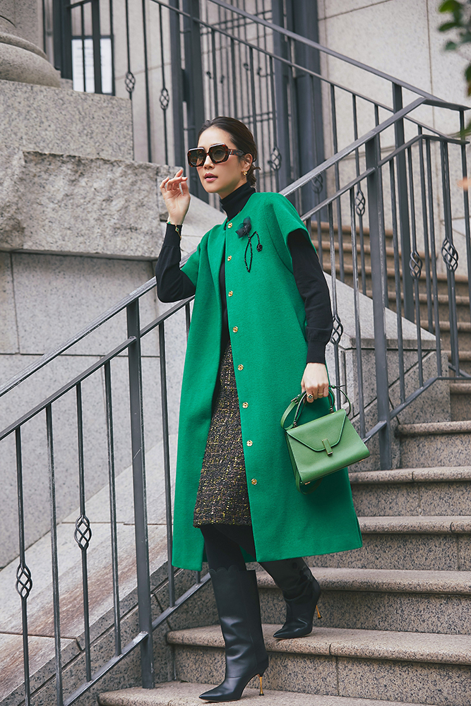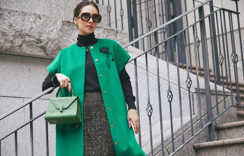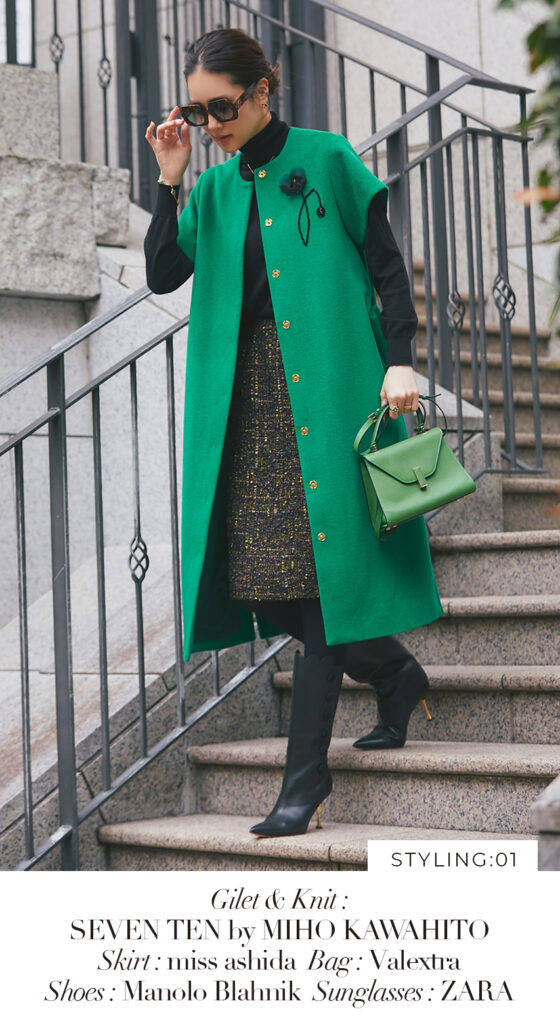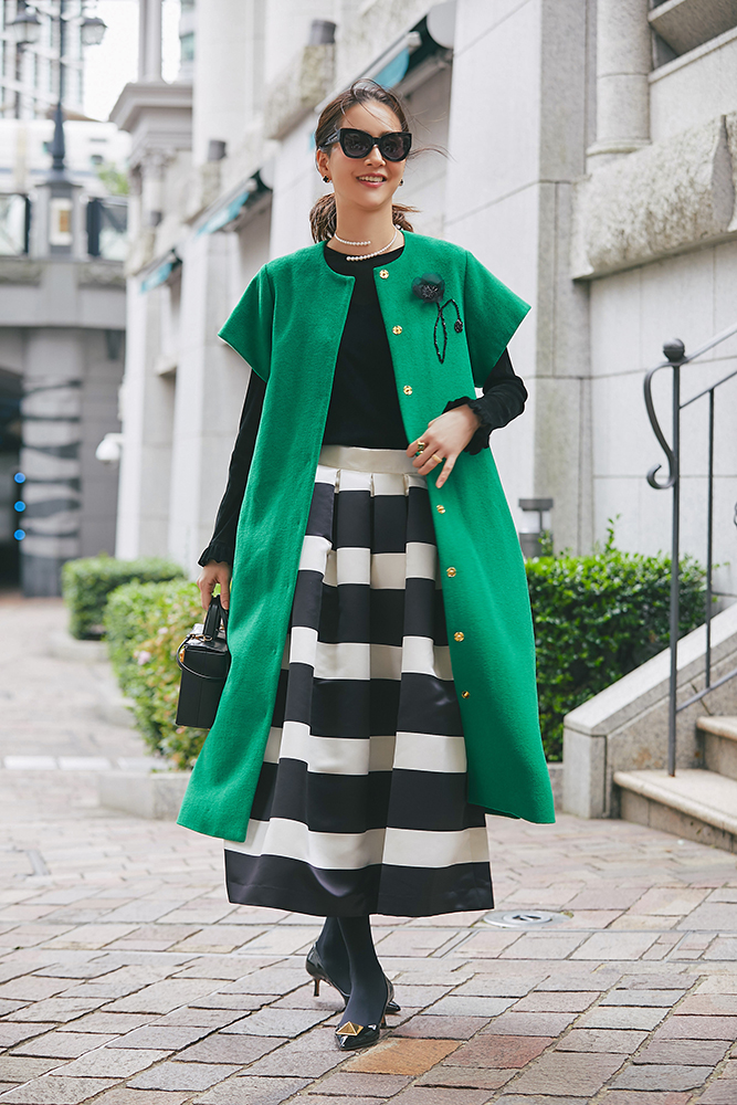 21 モチーフジレワンピース(グリーン) ¥44,000 / ベロアタッチシアートップス(ブラック) ¥26,400 / ボーダーサテンスカート(オフホワイト×ブラック) ¥38,500