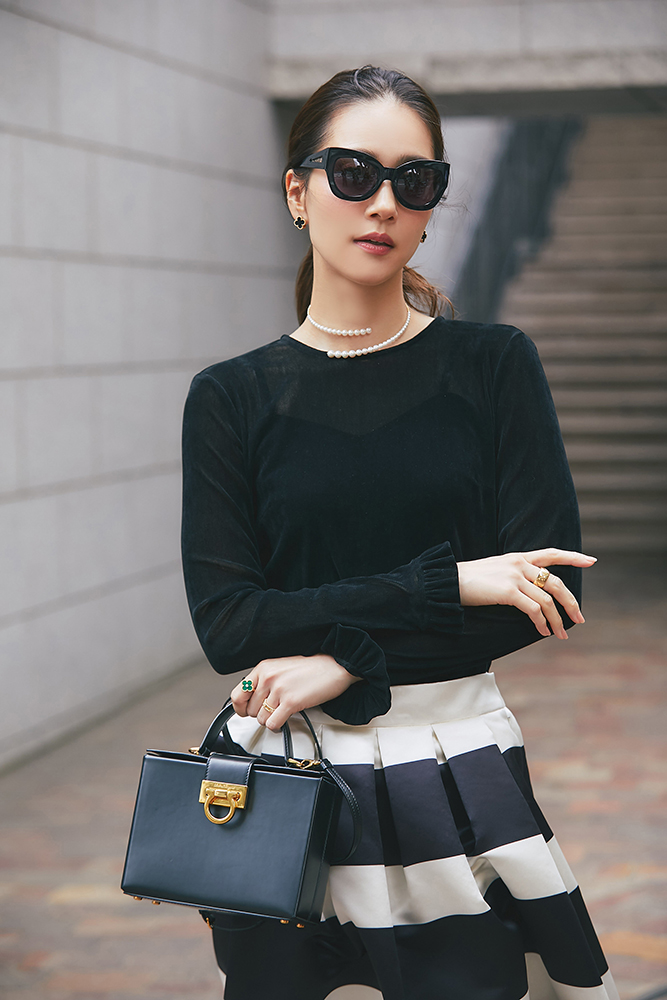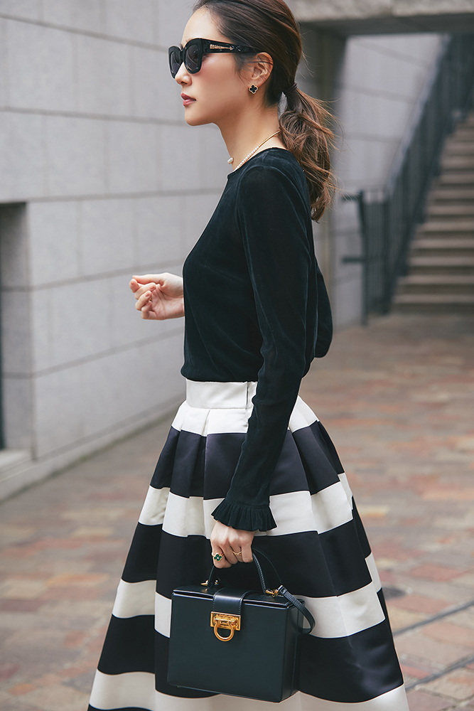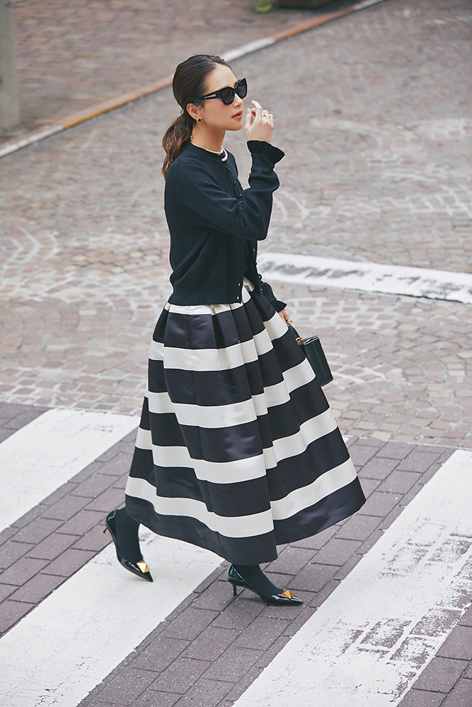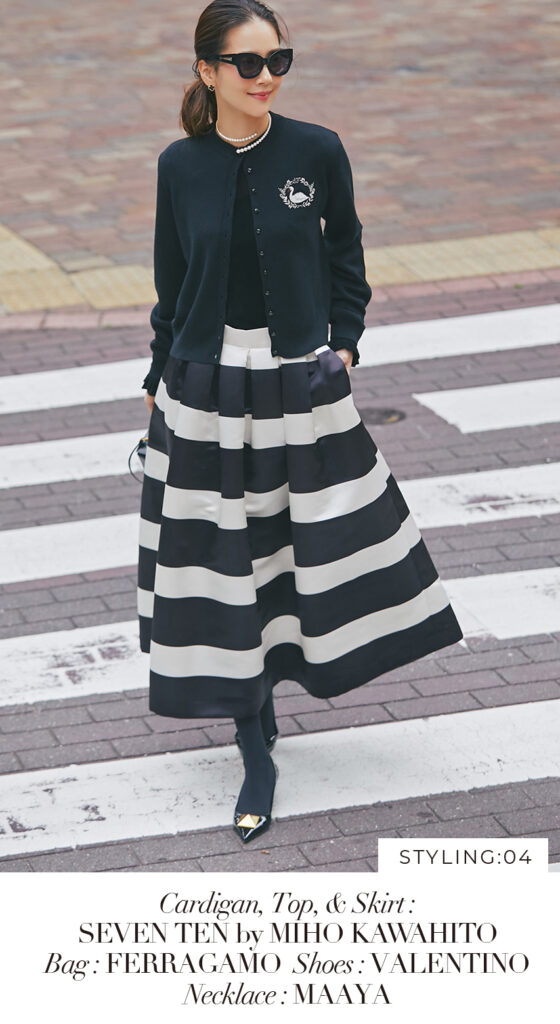 4 ワンポイント刺繍カーディガン(ブラック) ¥33,000 / ベロアタッチシアートップス(ブラック) ¥26,400 / ボーダーサテンスカート(オフホワイト×ブラック) ¥38,500