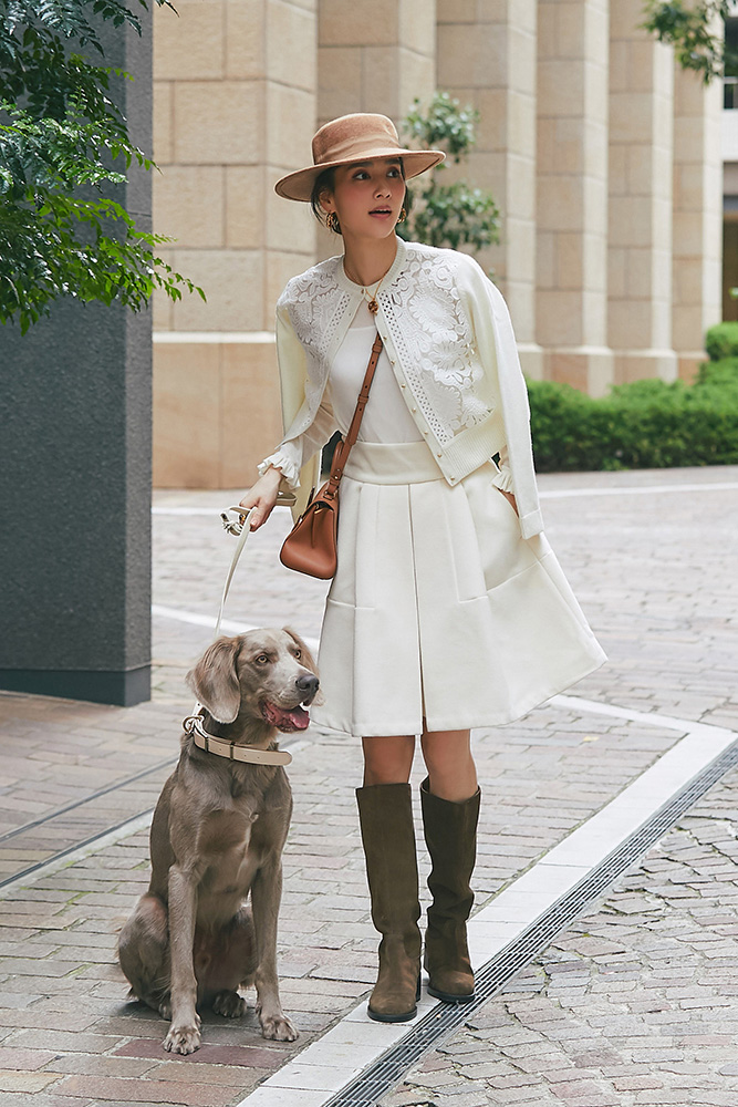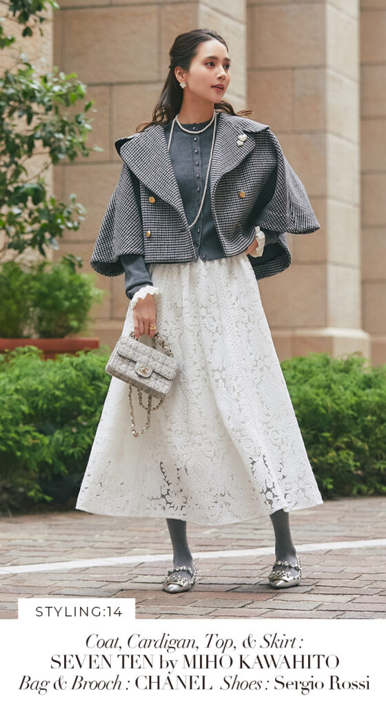 14 ダブルブレストショートコート(チェック) ¥44,000 / ワンポイント刺繍カーディガン(グレー) ¥33,000 / ベロアタッチシアートップス(オフホワイト) ¥26,400 / パネルレーススカート(ホワイト) ¥41,800