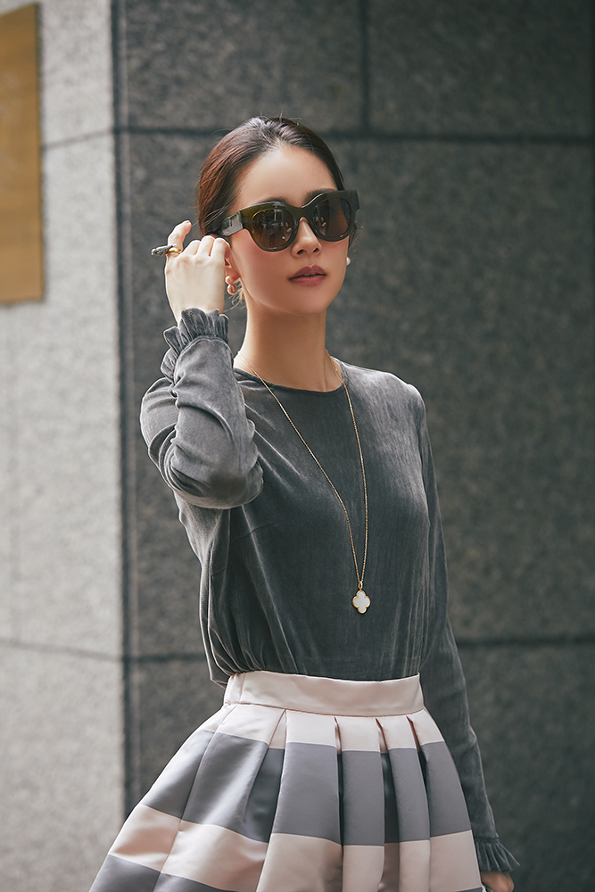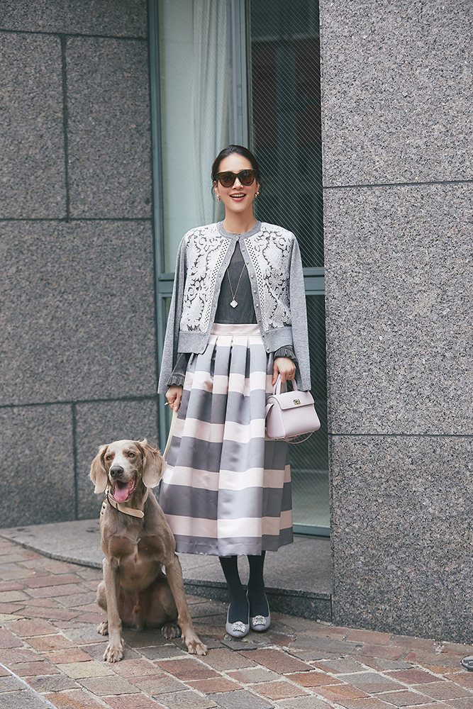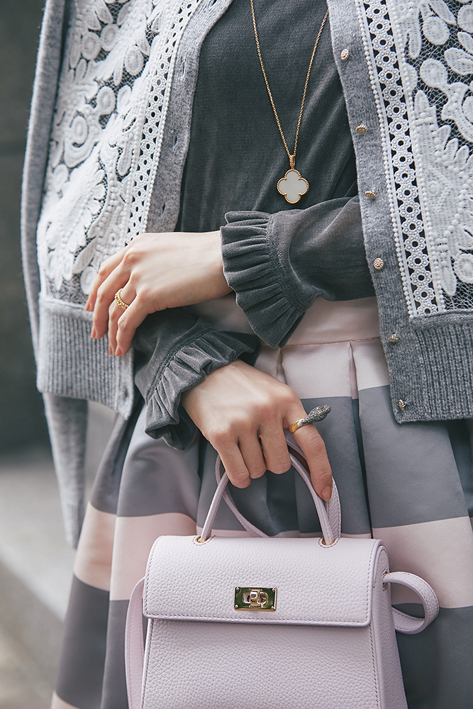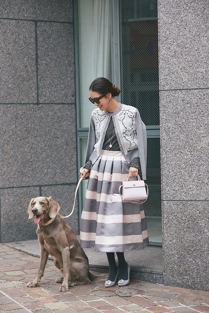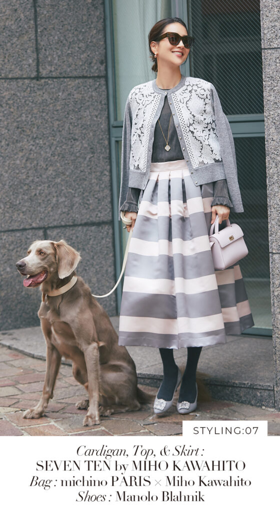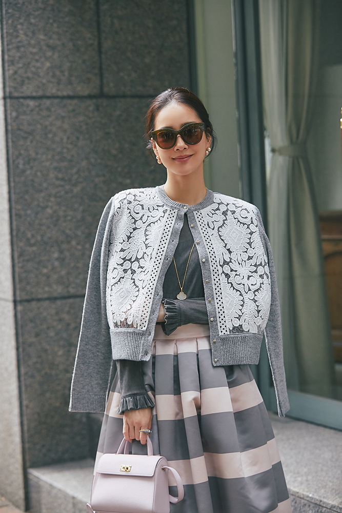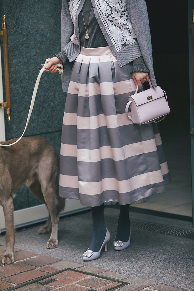 7 レースカーディガン(グレー) ¥42,900 / ベロアタッチシアートップス(グレー) ¥26,400 / ボーダーサテンスカート(グレー×ピンク) ¥38,500