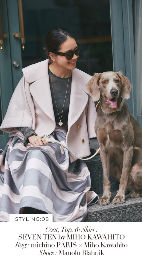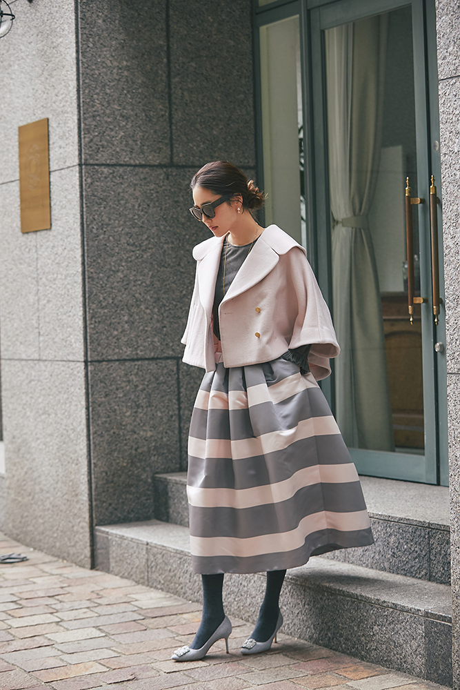 8 ダブルブレストショートコート(ピンク) ¥44,000 / ベロアタッチシアートップス(グレー) ¥26,400 / ボーダーサテンスカート(グレー×ピンク) ¥38,500