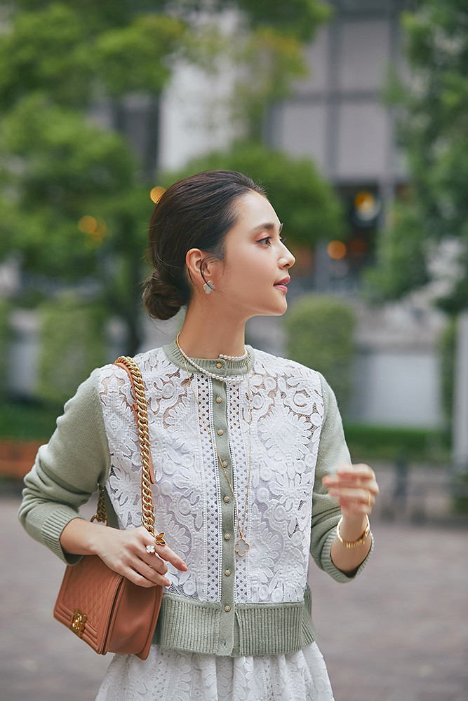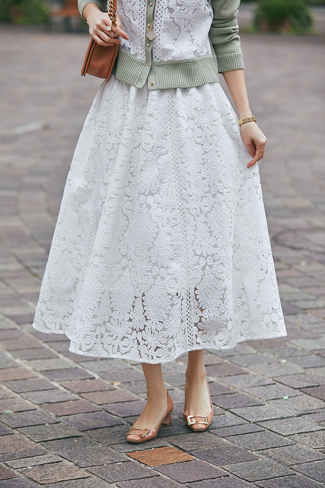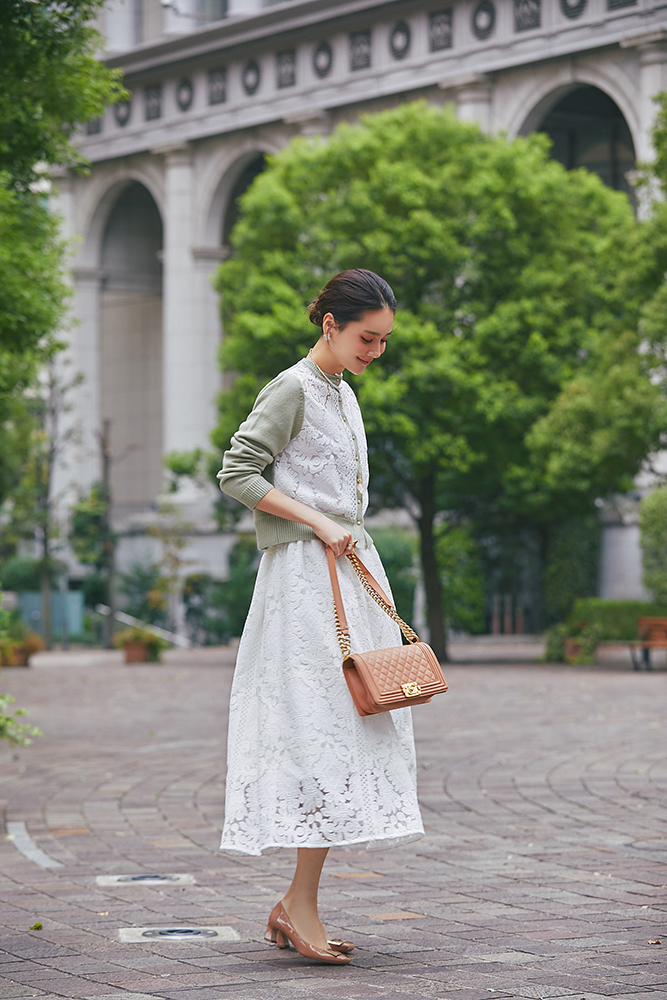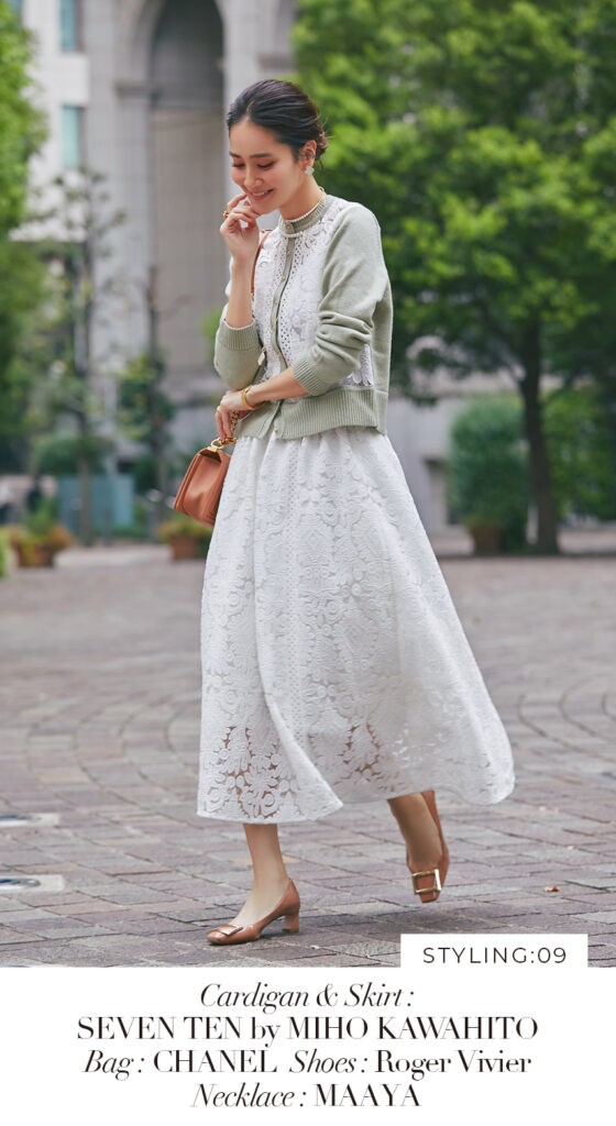 9 レースカーディガン(ミストグリーン) ¥42,900 / パネルレーススカート(ホワイト) ¥41,800