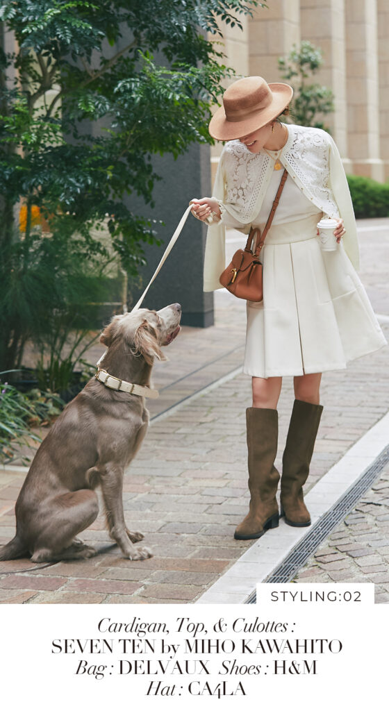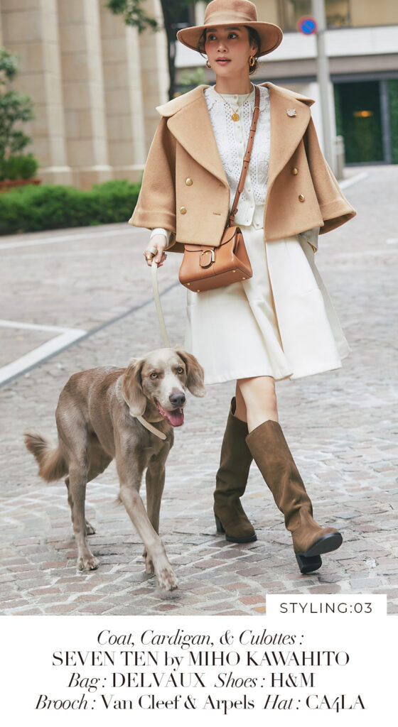 3 ダブルブレストショートコート(キャメル) ¥44,000 / レースカーディガン(ホワイト) ¥42,900