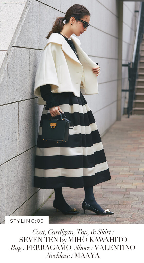5 ダブルブレストショートコート(ホワイト) ¥44,000 / ワンポイント刺繍カーディガン(ブラック) ¥33,000 / ベロアタッチシアートップス(ブラック) ¥26,400 / ボーダーサテンスカート(オフホワイト×ブラック) ¥38,500