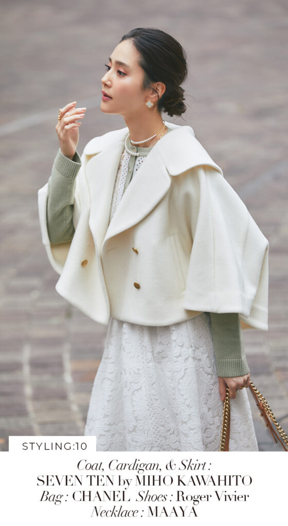 10 ダブルブレストショートコート(ホワイト) ¥44,000 / レースカーディガン(ミストグリーン) ¥42,900 / パネルレーススカート(ホワイト) ¥41,800