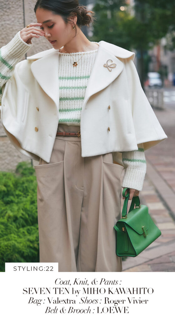 22 ダブルブレストショートコート(ホワイト) ¥44,000 / ニット 11月発売予定 / パンツ 2025年1月発売予定