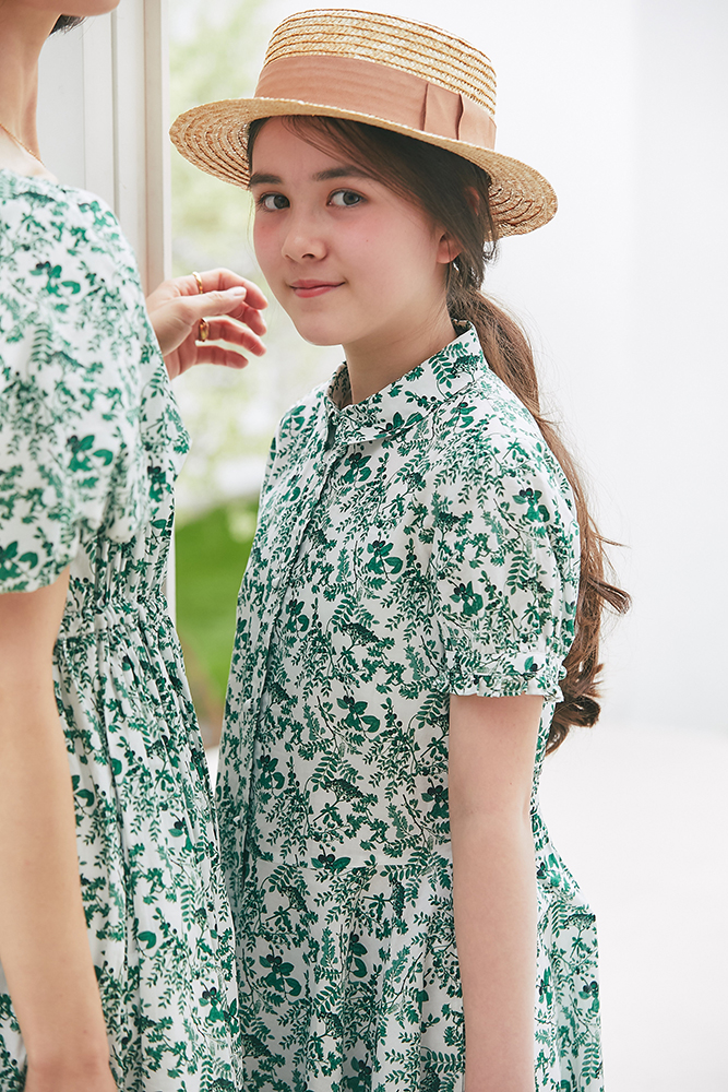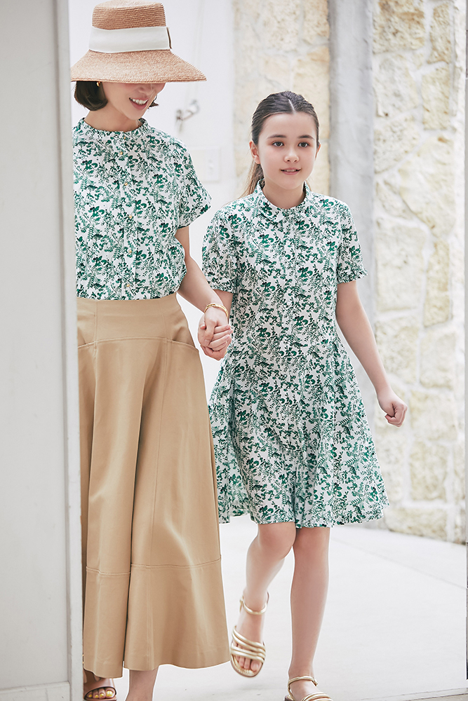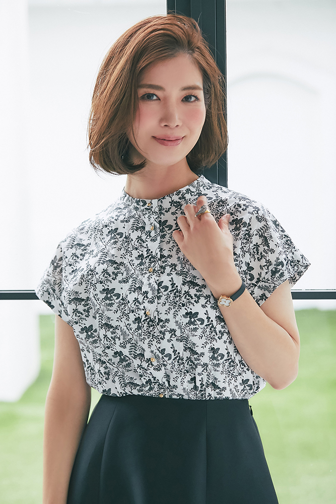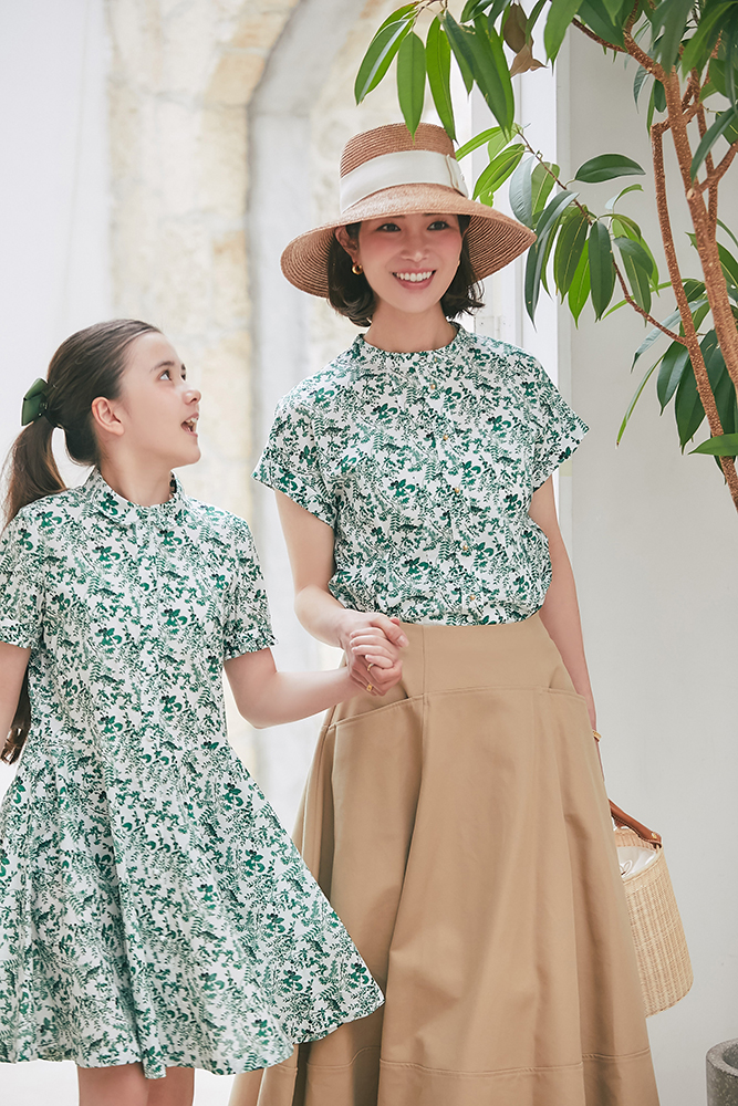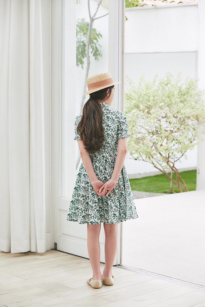 様々な枝葉を繊細に描いた上品な柄行きに、控えめに艶めくマットなゴールドボタンがアクセントをプラス。スタンドカラーとフロントのタックが、甘さを抑えながらも立体感のある美しいシルエットを生み出します。肩まわりを優しく包み込むフレンチスリーブで、さりげなく体型カバーも叶えます。