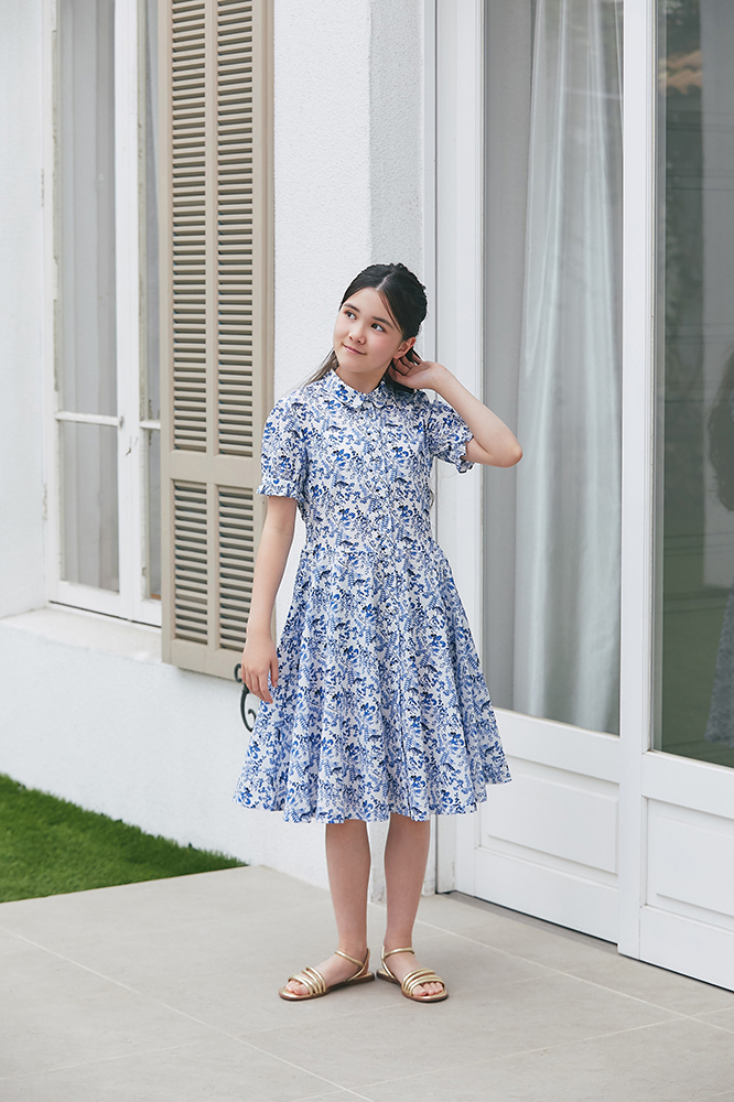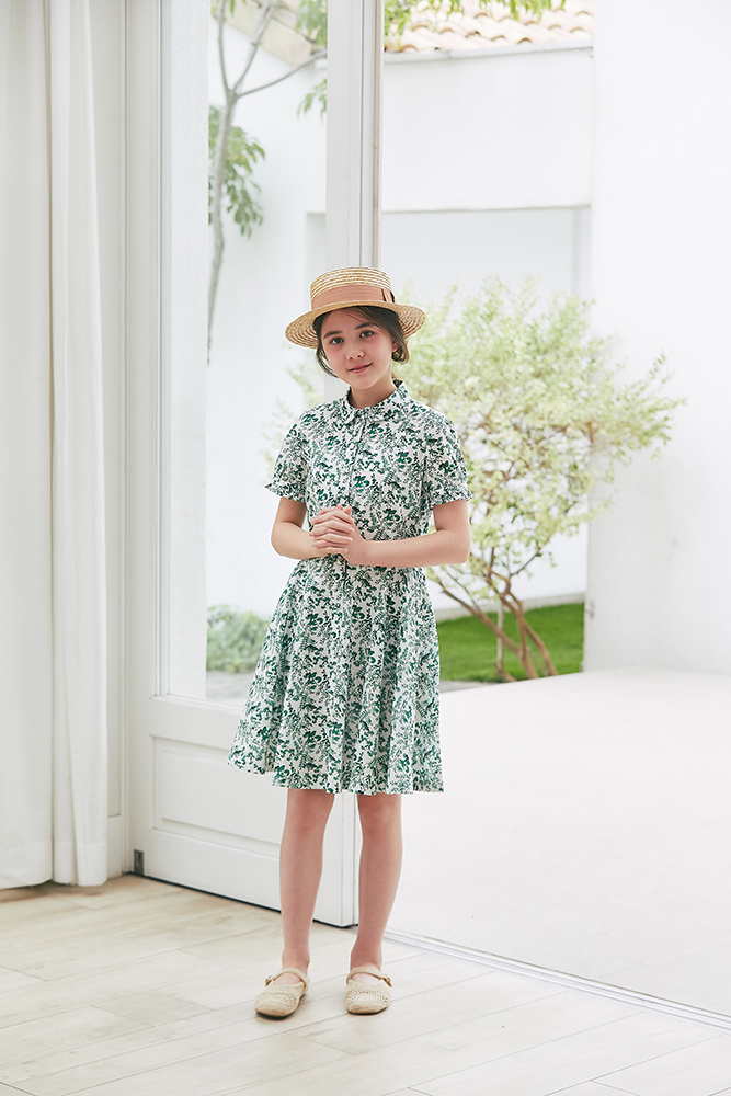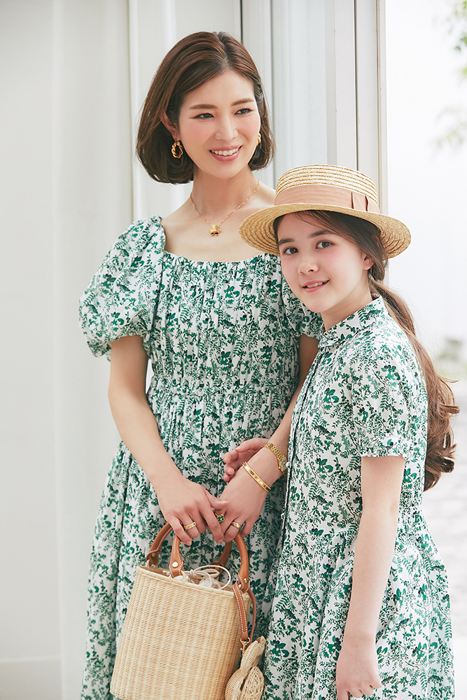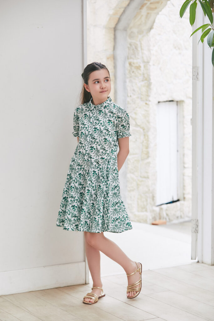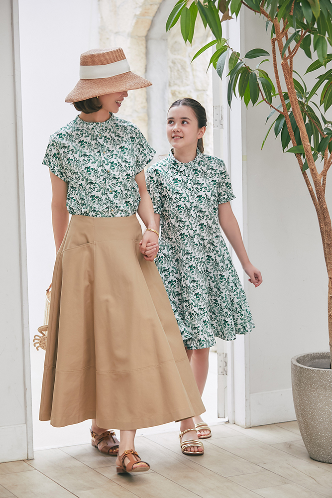 様々な枝葉を繊細に描いた上品な柄行きに、控えめに艶めくマットなゴールドボタンがアクセントをプラス。スタンドカラーとフロントのタックが、甘さを抑えながらも立体感のある美しいシルエットを生み出します。肩まわりを優しく包み込むフレンチスリーブで、さりげなく体型カバーも叶えます。