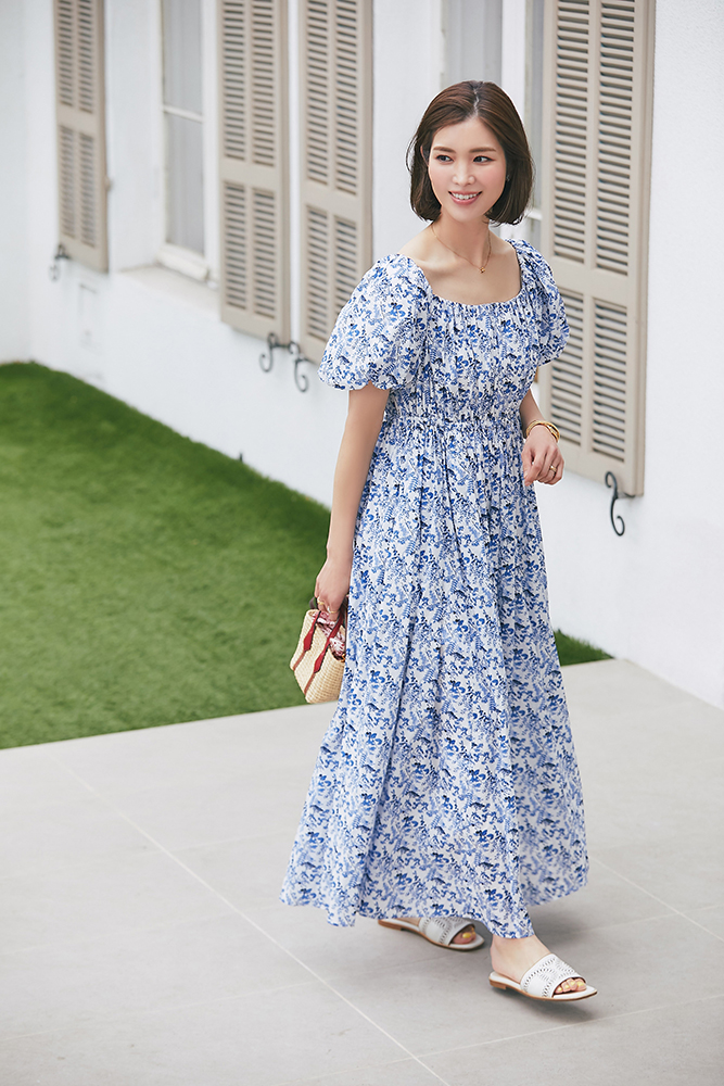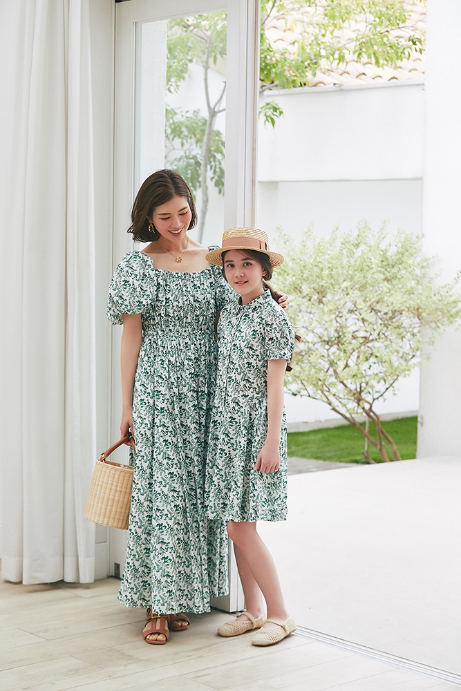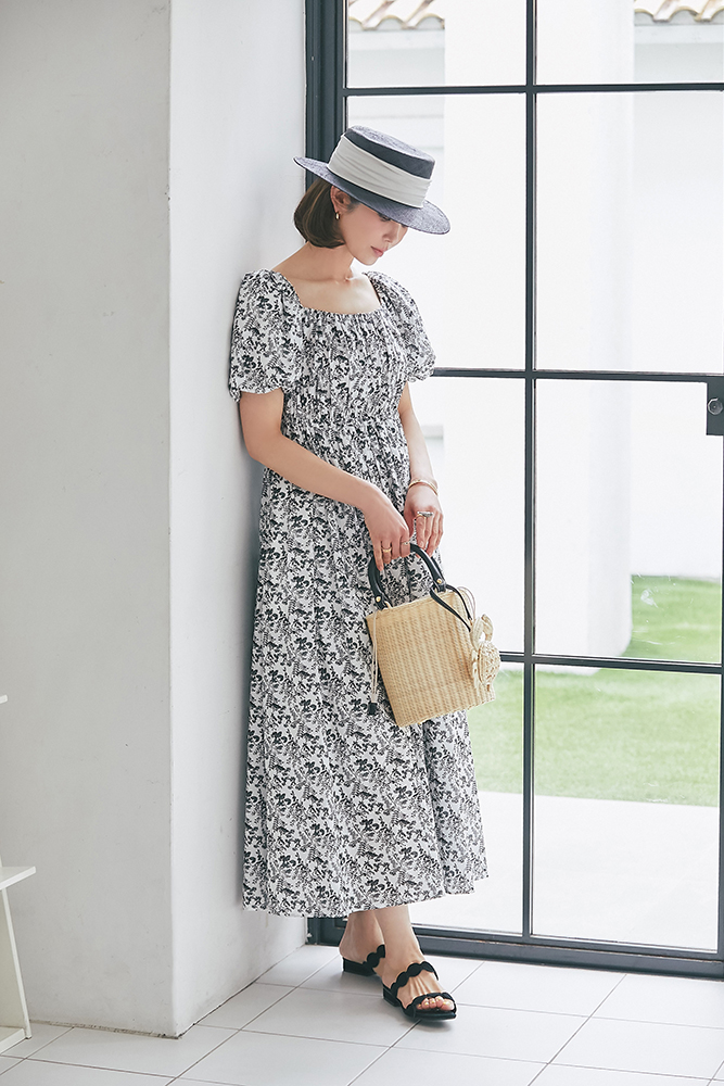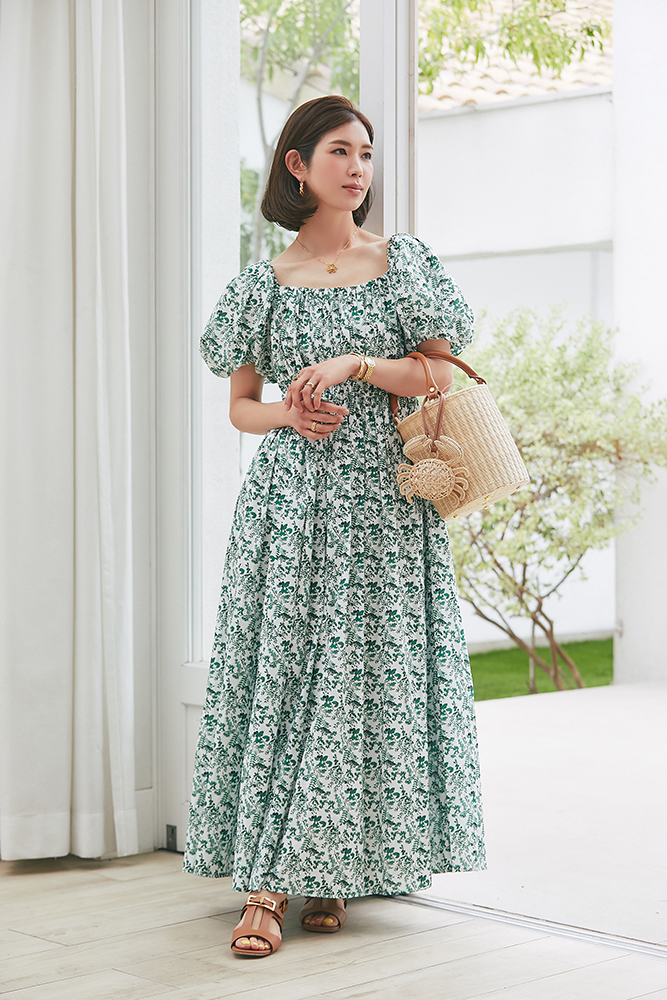 ふんわりとしたパフスリーブと、ギャザーを贅沢に寄せたスクエアネックがデコルテを美しく引き立て、華やかで柔らかな印象に。リラクシーでありながら、大人のエレガンスを醸す1枚です。日常からリゾートまで幅広いシーンで活躍してくれる、夏の主役ワンピース。