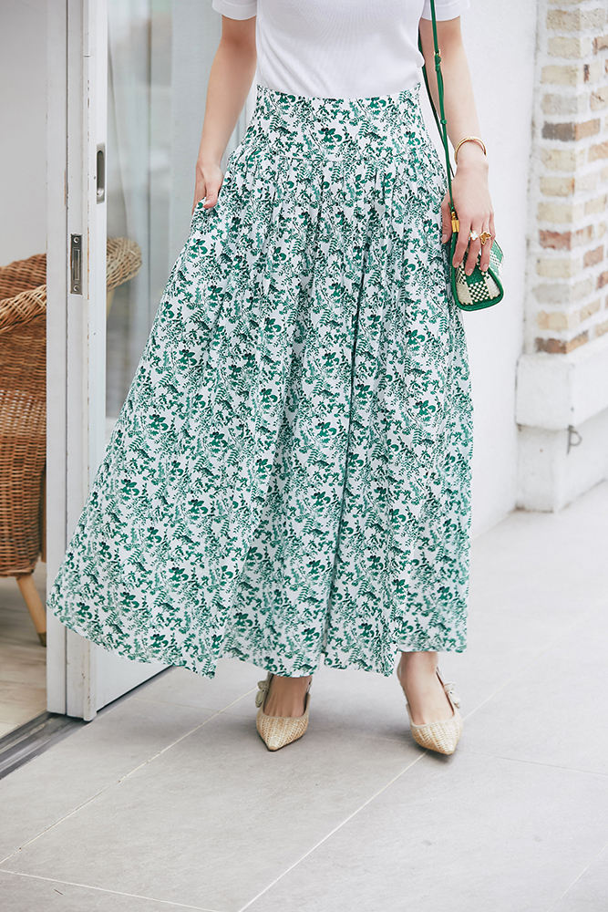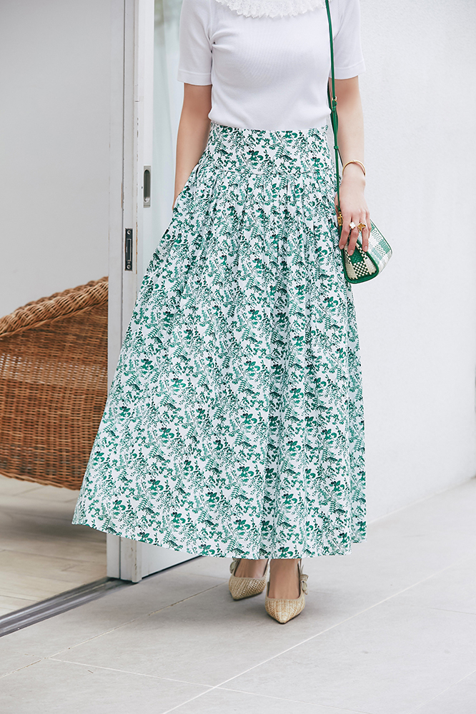 様々な枝葉を繊細に描いた上品な柄行きと、ドラマティックなシルエットがコーディネートを華やかに演出。広めに取ったベルト幅でウエスト周りもスッキリ見えます。ウエスト後ろはシャーリングゴム仕様で着心地も兼備。合わせるトップス次第で、きれいめ〜カジュアルまで、幅広いテイストに着こなせます。